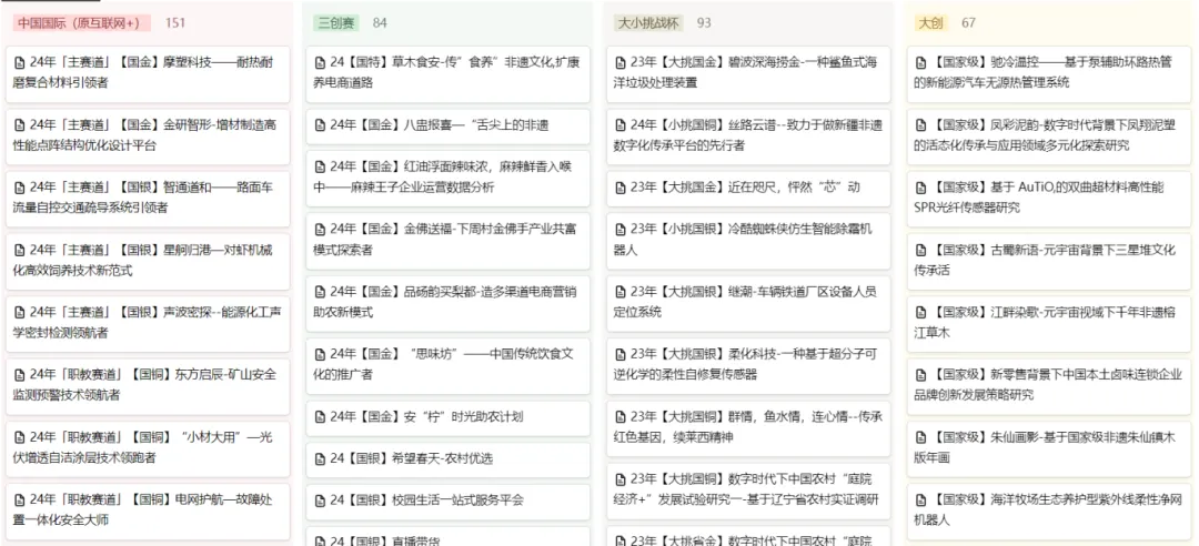 点此段文字查看近六年(2020-2025)400+省国奖作品,包含大创省国级立项和结项作品、中国国际大学生创新大赛(互联网+)、挑战杯大小挑、三创赛省国奖案例。每份案例包括完整的计划书+PPT+获奖证明+转让协议(永久更新)