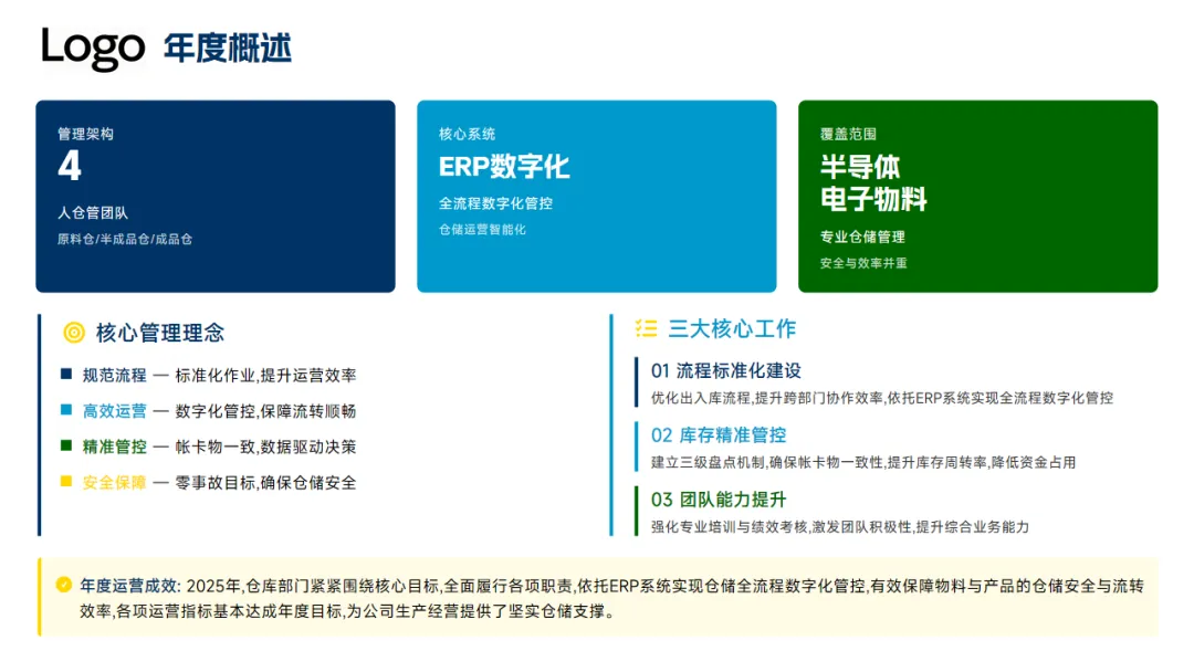作为仓库部门负责人,对本年度仓库管理部门年终工作总结如下:本部门围绕公司“规范流程、高效运营、精准管控、安全保障”的目标,统筹原料仓、半成品仓、成品仓三大主要区域,依托ERP系统实现了对货物的数字化管控,有效保障了各类原料、半成品、成品的仓储安全与流转效率。