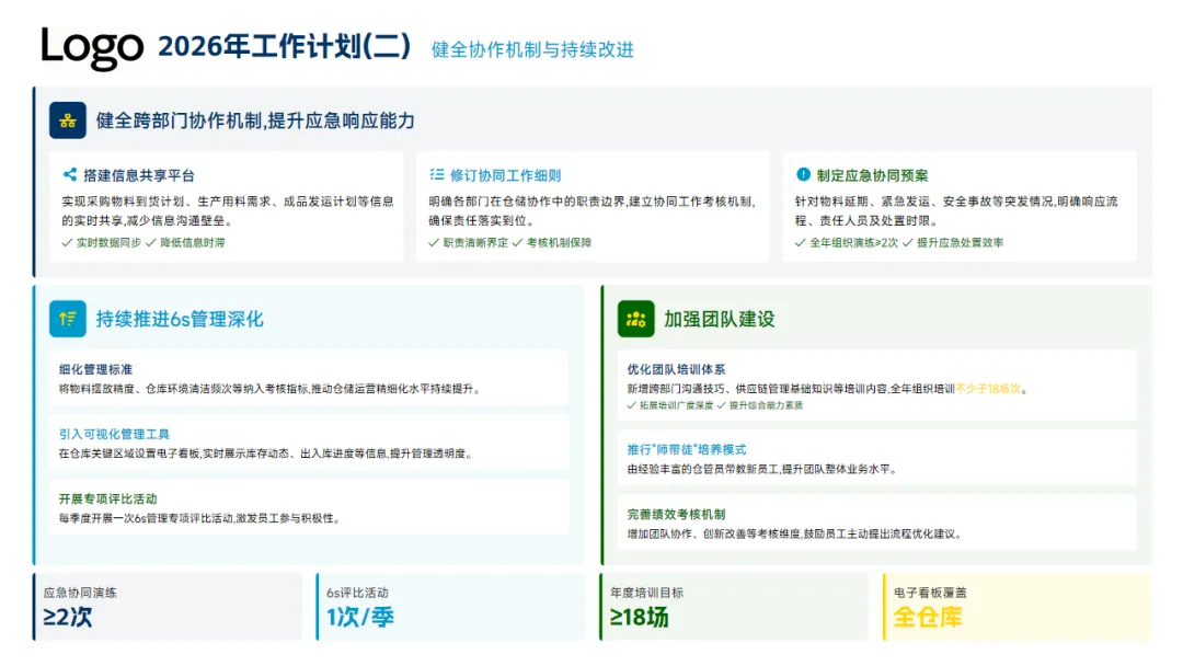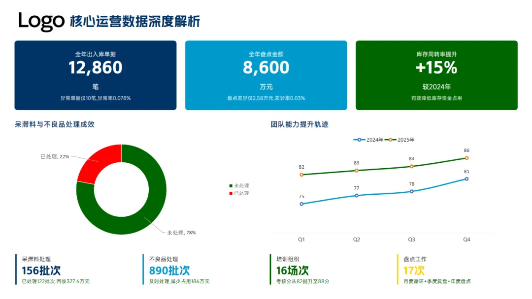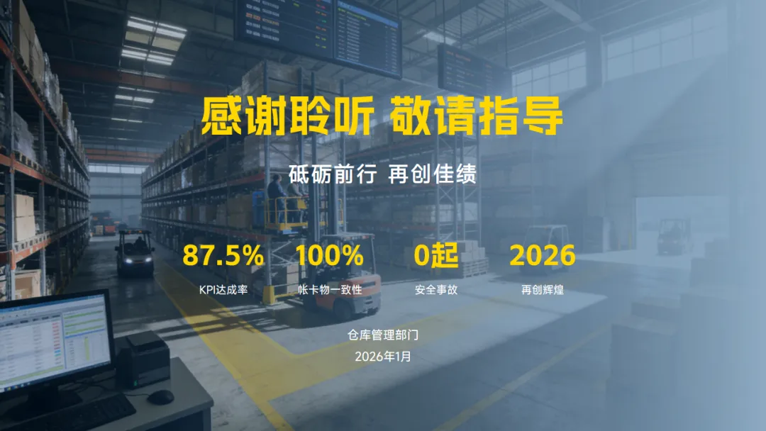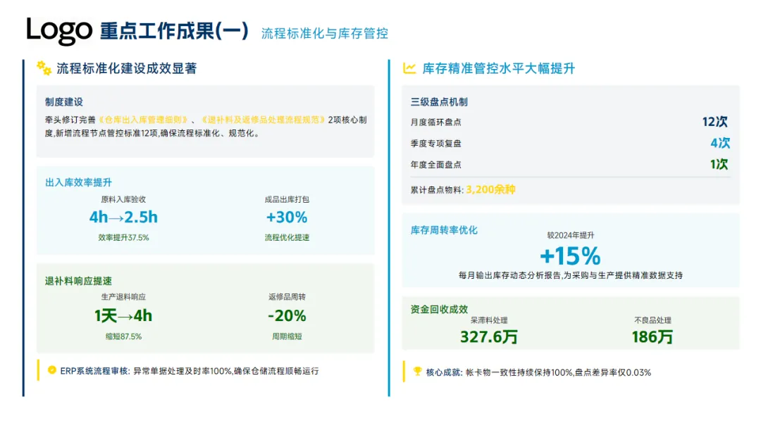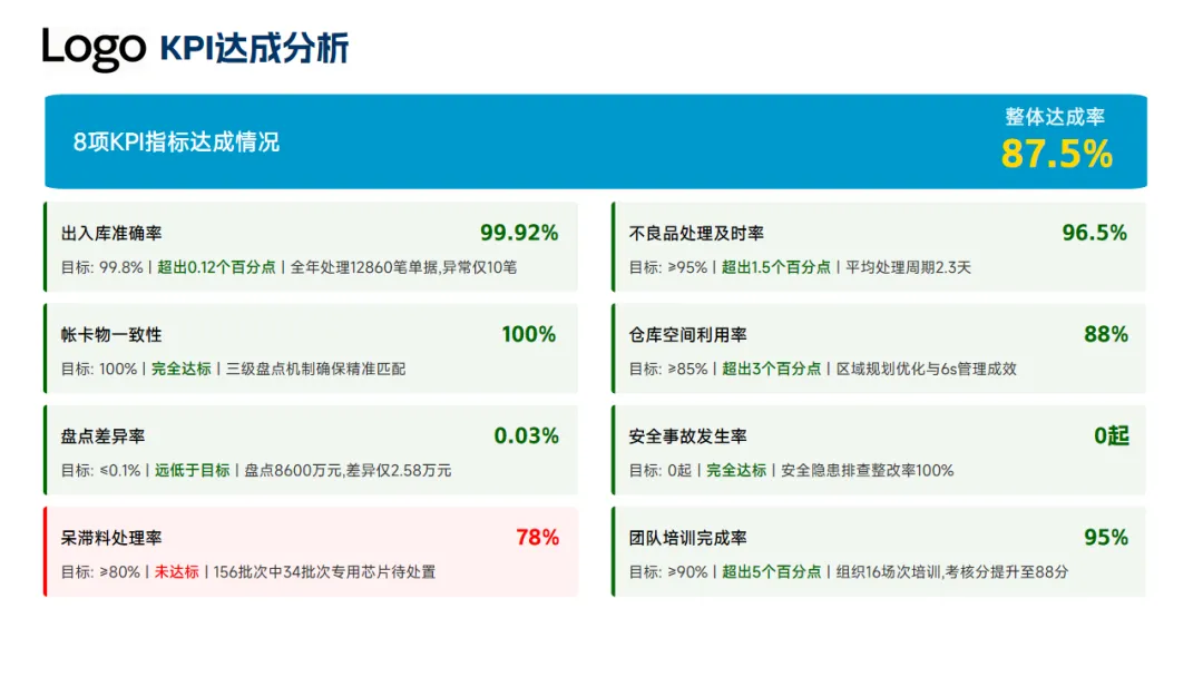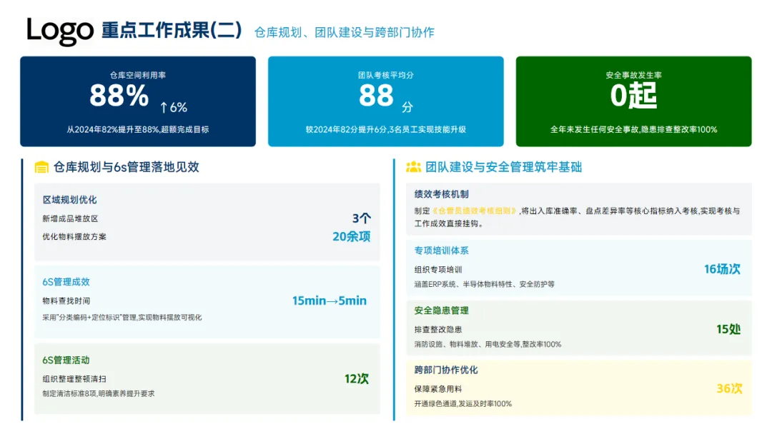 本年度的亮点工作一是推进了流程标准化、库存精准管控以及工作会员的能力提升,8项关键KPI达成率87.5%,出入库准确率超99.92%、帐卡物一致性100%,同时仓库空间利用率提升到了88%,安全事故零发生。