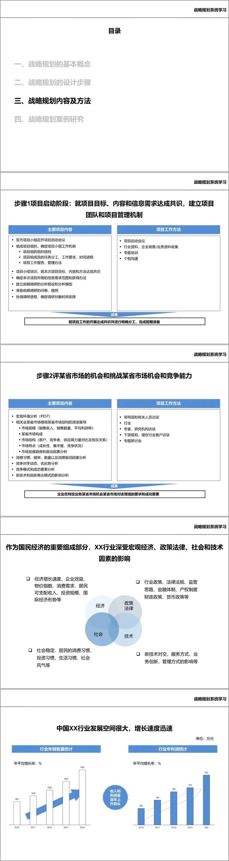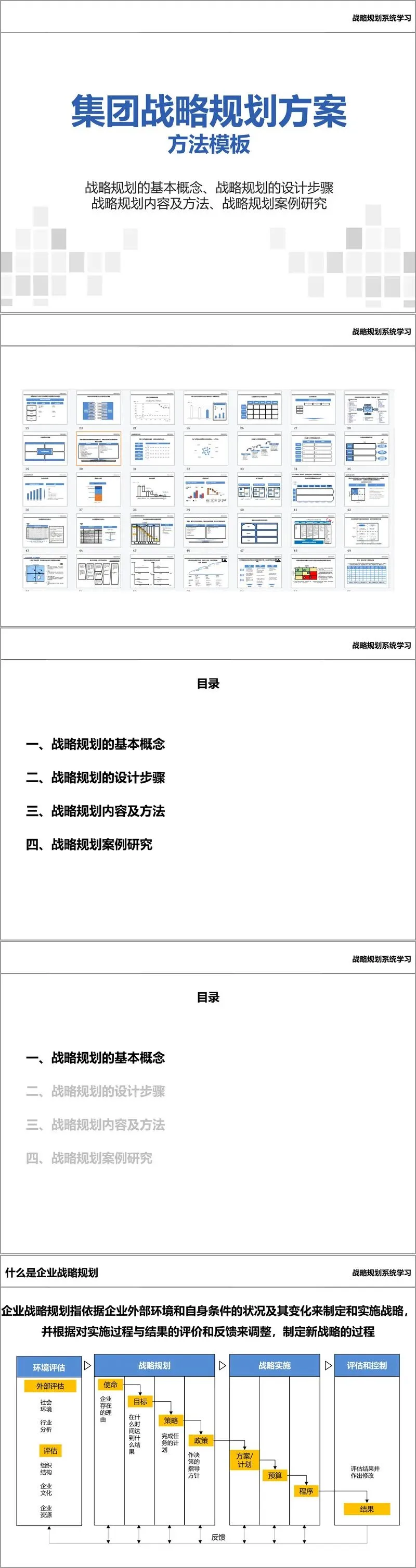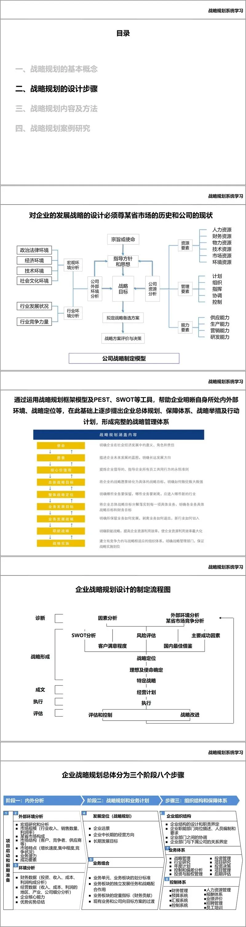 资料重点解析了战略规划的设计步骤,将其科学地划分为三个阶段共八个环节。第一阶段聚焦内外部分析:通过项目启动明确任务与团队,继而运用PEST、五种力量模型等工具深入剖析宏观环境、行业格局、市场竞争态势及关键成功要素;同时,系统梳理企业自身的战略沿革、财务状况、核心能力与资源禀赋,客观识别优势与短板。第二阶段是战略规划与业务计划的核心环节:基于分析结论,明确企业的使命、愿景与价值观,设定中长期战略目标与竞争定位;运用波士顿矩阵、GE矩阵等工具进行业务组合分析,区分核心业务、战略业务与种子业务,并制定相应的发展策略;进而构建财务模型,对战略方案的可行性与回报进行预测评估。第三阶段则关注实施保障:设计匹配战略的组织架构,界定部门职责与岗位设置,优化关键管理流程如战略管理、投资决策、预算控制与绩效考评,并完善人力资源、财务监控等配套机制,确保战略执行有力、闭环管理。