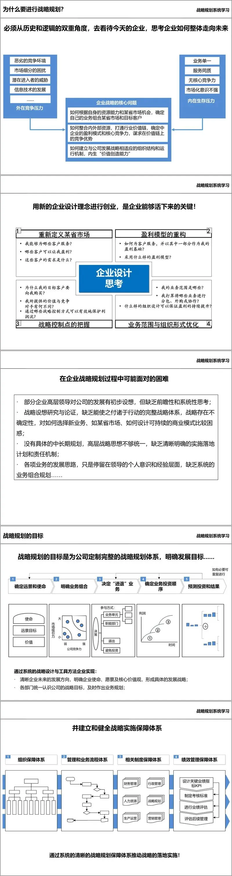 战略规划的基本概念部分,首先界定了企业战略规划的本质——它是一个动态调整的过程,企业基于对外部环境与内部能力的系统分析,确立发展目标与行动路径,并通过持续的评价反馈对战略进行优化迭代。资料强调,企业必须从历史与逻辑的双重角度审视自身,以全新的企业设计理念突破成长瓶颈。当前许多企业在战略制定中常面临高层设想缺乏系统性、战略论证不充分、中长期规划缺失及实施责任机制模糊等现实困境。因此,战略规划的深层目标在于为企业量身定制完整的战略管理体系,明确发展愿景与目标,统一各部门的认识,并建立包括组织保障、制度保障与绩效管理在内的战略落地支撑体系。