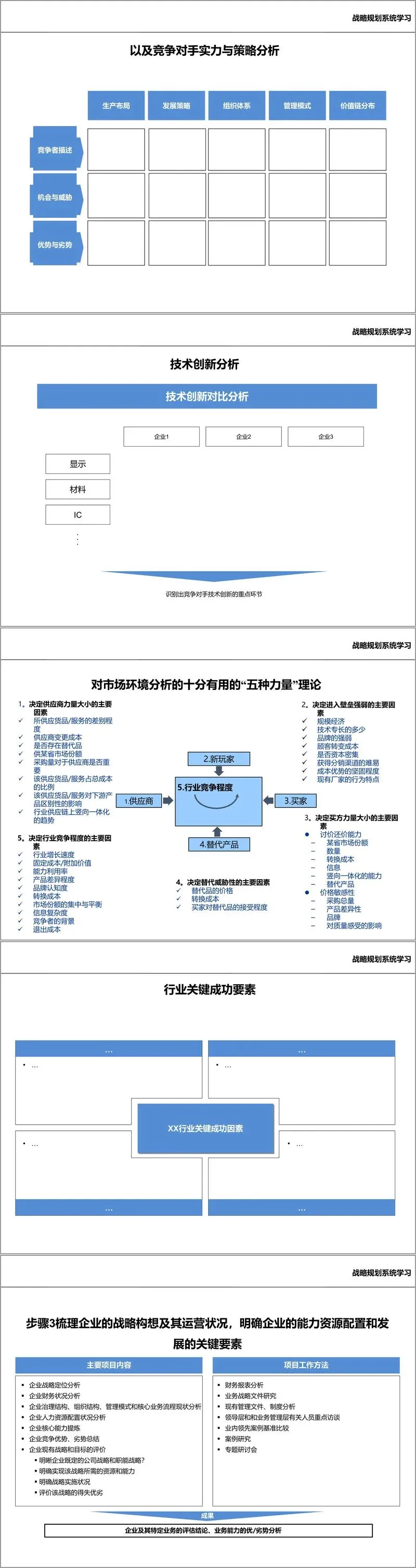 在战略规划内容及方法上,资料提供了详尽的操作指南。例如,在外部环境分析中,强调应关注行业规模、结构、增长速度及消费者行为演变等关键维度;在内部评估时,需从治理结构、运营效率、人力资源等多方面进行能力审计。尤为重要的是,资料引入了“企业资源与能力分析矩阵”,指导企业将资源投入聚焦于行业关键成功要素与企业自身优势重合的领域,从而构建可持续的竞争优势。此外,还详细展示了如何通过战略澄清工作坊,将抽象的战略意图转化为各部门、各业务单元清晰可执行的具体目标与行动计划,有效解决战略共识与落地难题。
