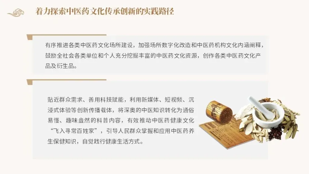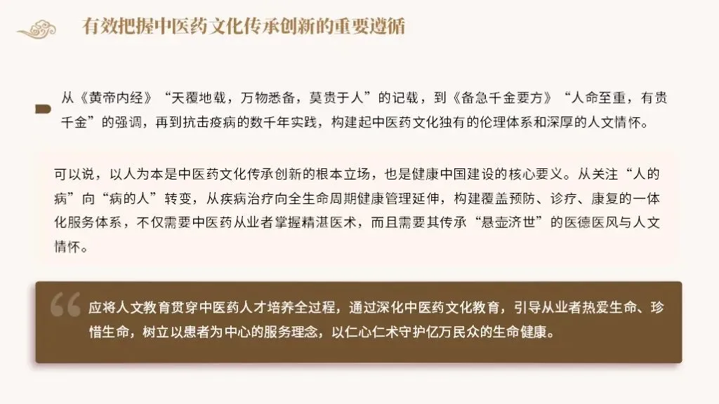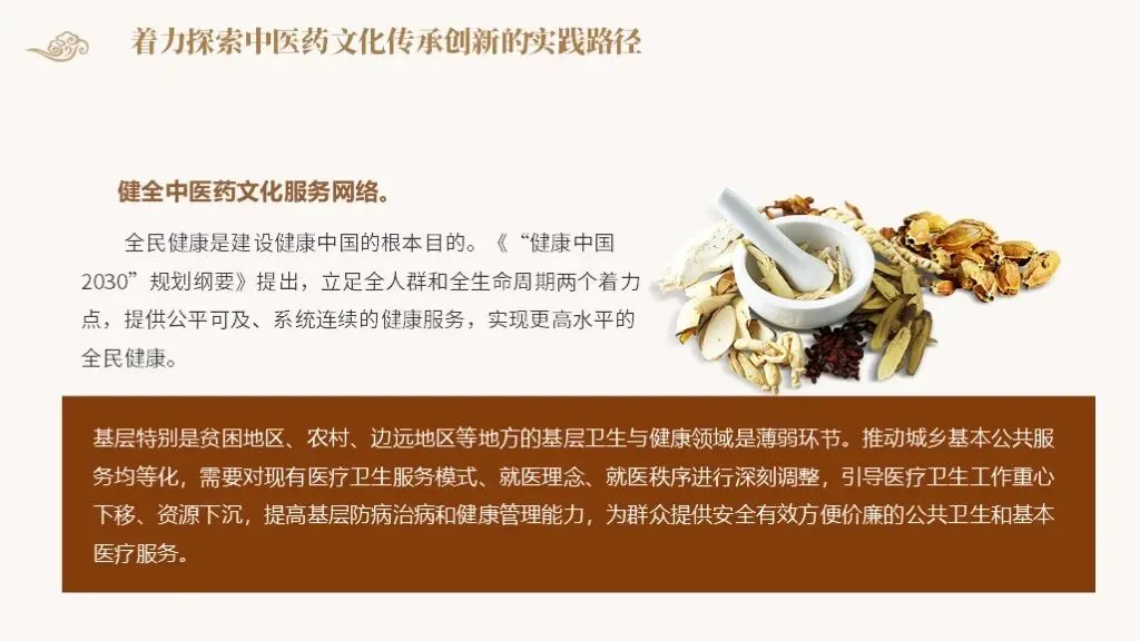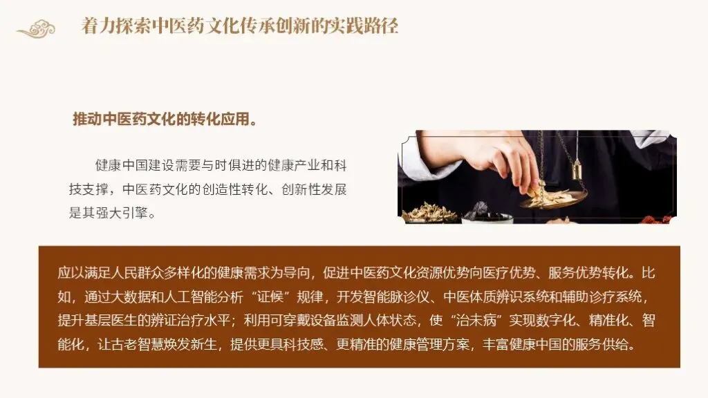 当AI技术遇上千年脉诊,会碰撞出怎样的火花?本课件用大量篇幅探讨了中医药与现代科技的融合:智能体质辨识系统、可穿戴设备监测等案例,生动诠释了“创造性转化”的内涵。编者注意到,课件并未停留在技术层面,而是深入剖析如何通过数字化手段降低医疗成本、提升服务可及性。这种以科技赋能传统、以需求驱动创新的思路,为健康产业升级提供了切实可行的参考框架。