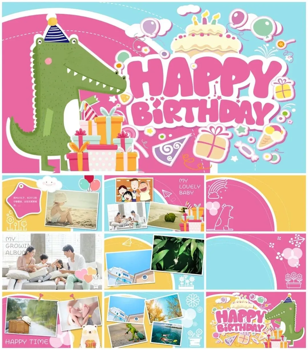 模板包括:宝宝生日、百日宴、成长相册、朋友生日、情侣生日、员工生日会、老人寿宴等。