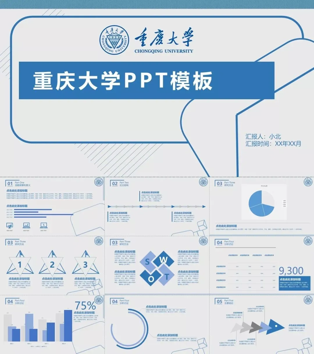 包含了高校专属校徽,100+套精选PPT,正式大气中又不失高级活泼,很能展现个性与品位,适用于各种毕业答辩、总结汇报、活动策划、个人简历、宣传推广等场合。快快收好!