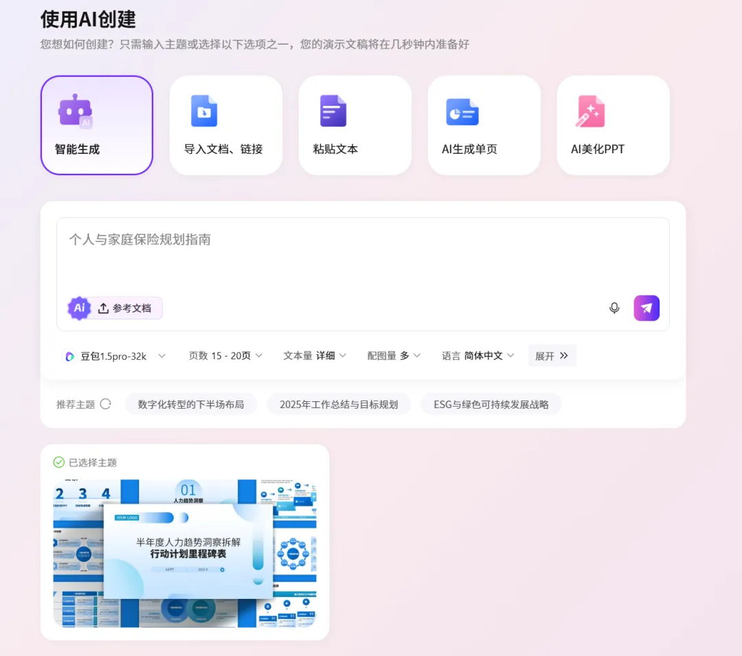 1. AI快速生成模板:输入主题、风格、页数等简单关键词,即可自动生成多套PPT模板供选择,支持商务、校园、创意等多种风格,能适配不同场景的使用需求;