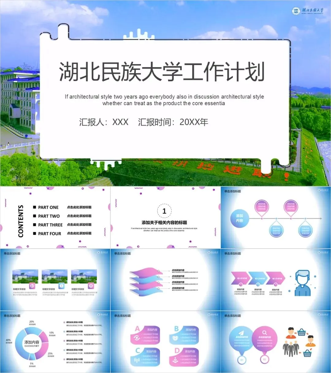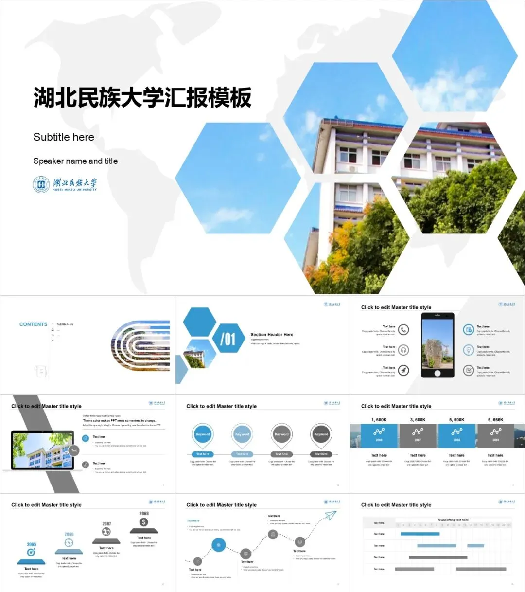 以上是我们为大家准备的湖北民族大学专属PPT模板,文中的所有板式都是可编辑的,大家可以上传替换自己喜欢的校园美景,做出具有自己风格的专属PPT哦!其他同学也可以给我留言