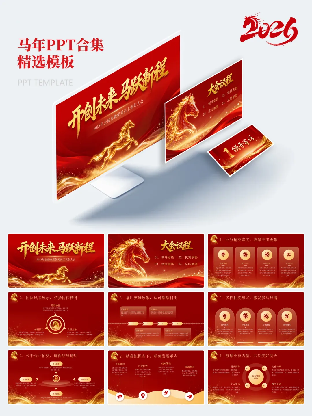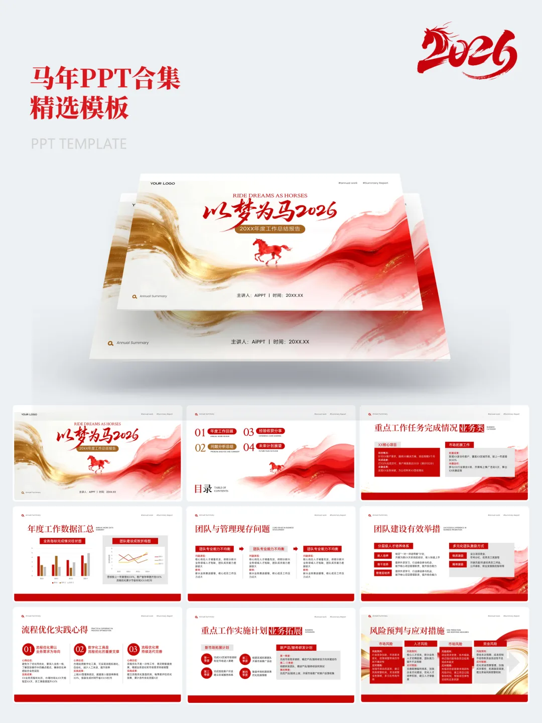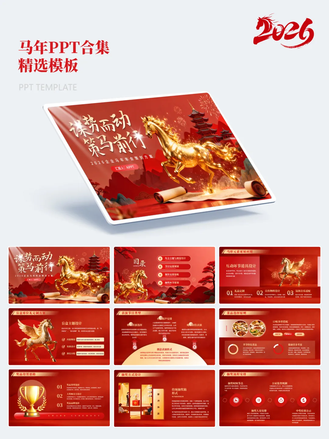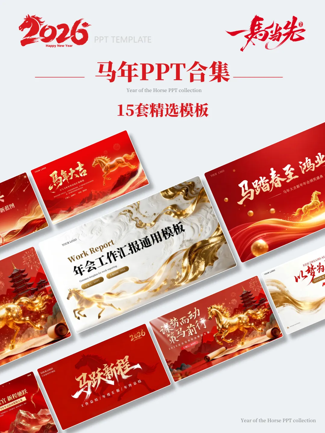 本次分享的模板合集共包含15套马年主题PPT,涵盖年度总结、述职汇报、年会活动、新春企划等多个应用场景。整体设计以红金、白金为主色调,辅以马年元素、传统纹样及现代几何图形,既体现节日氛围,又保持正式场合所需的庄重与严谨。