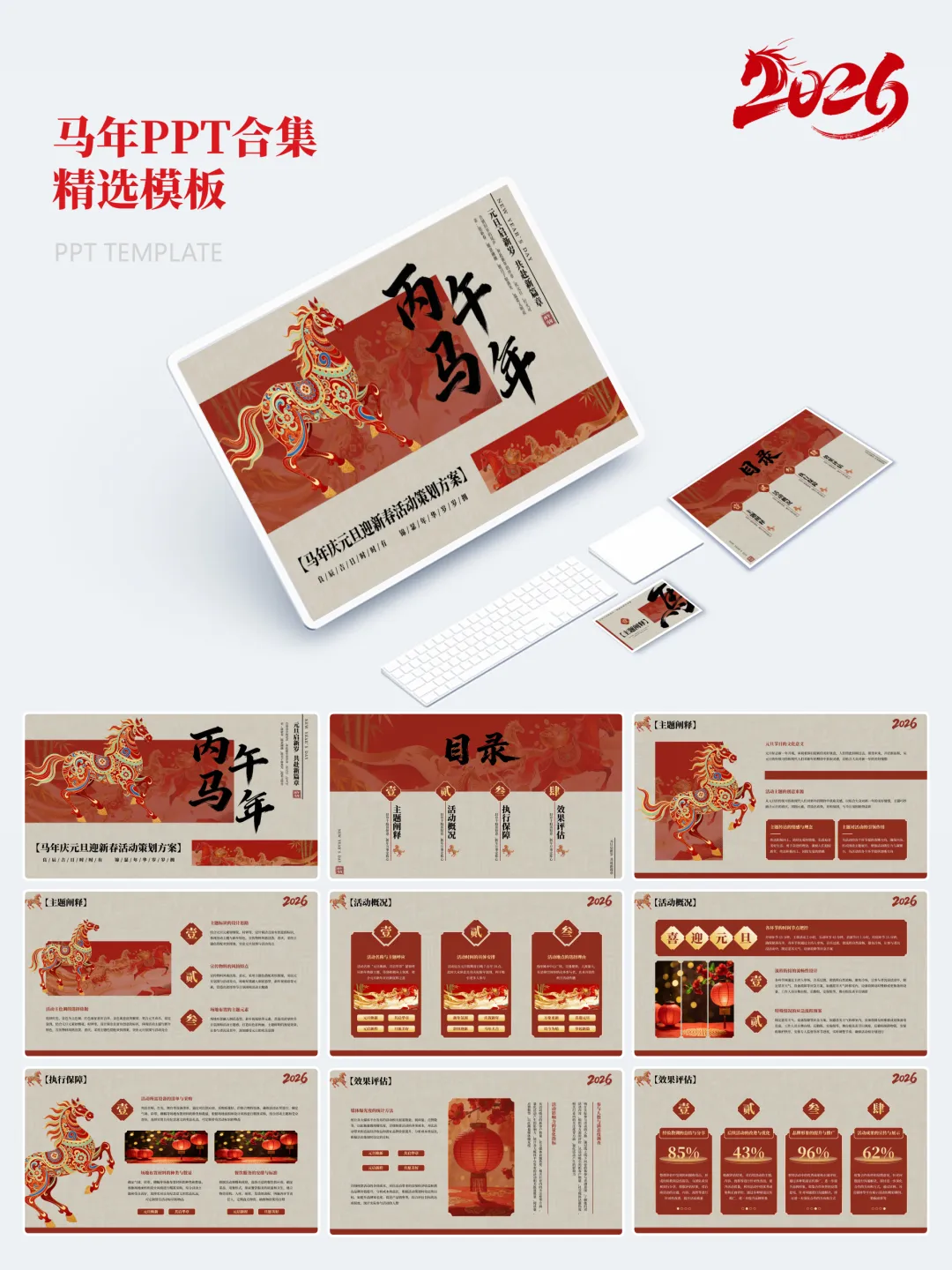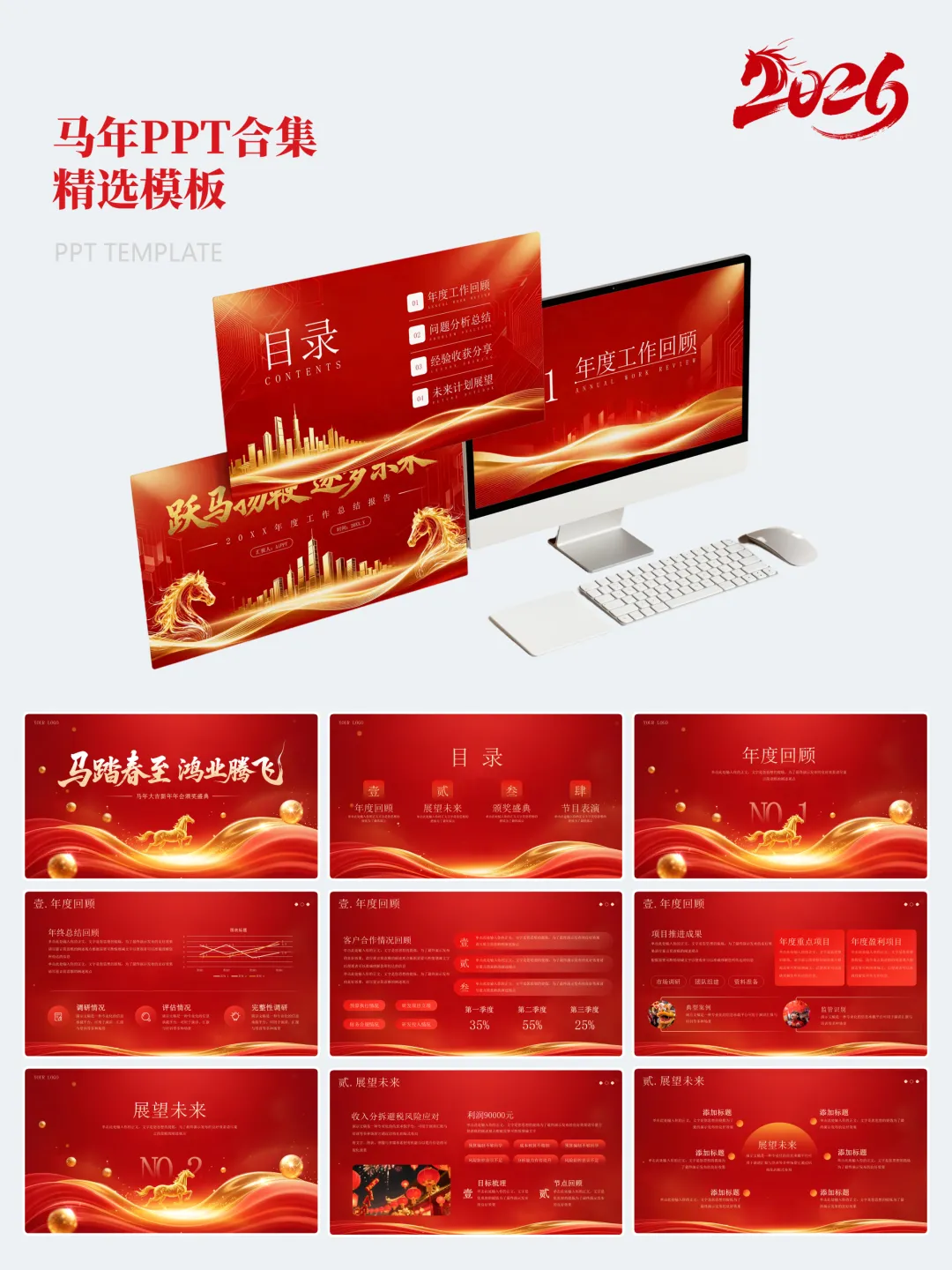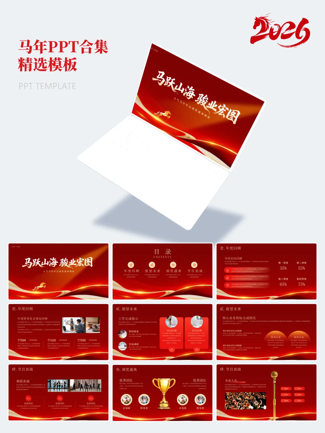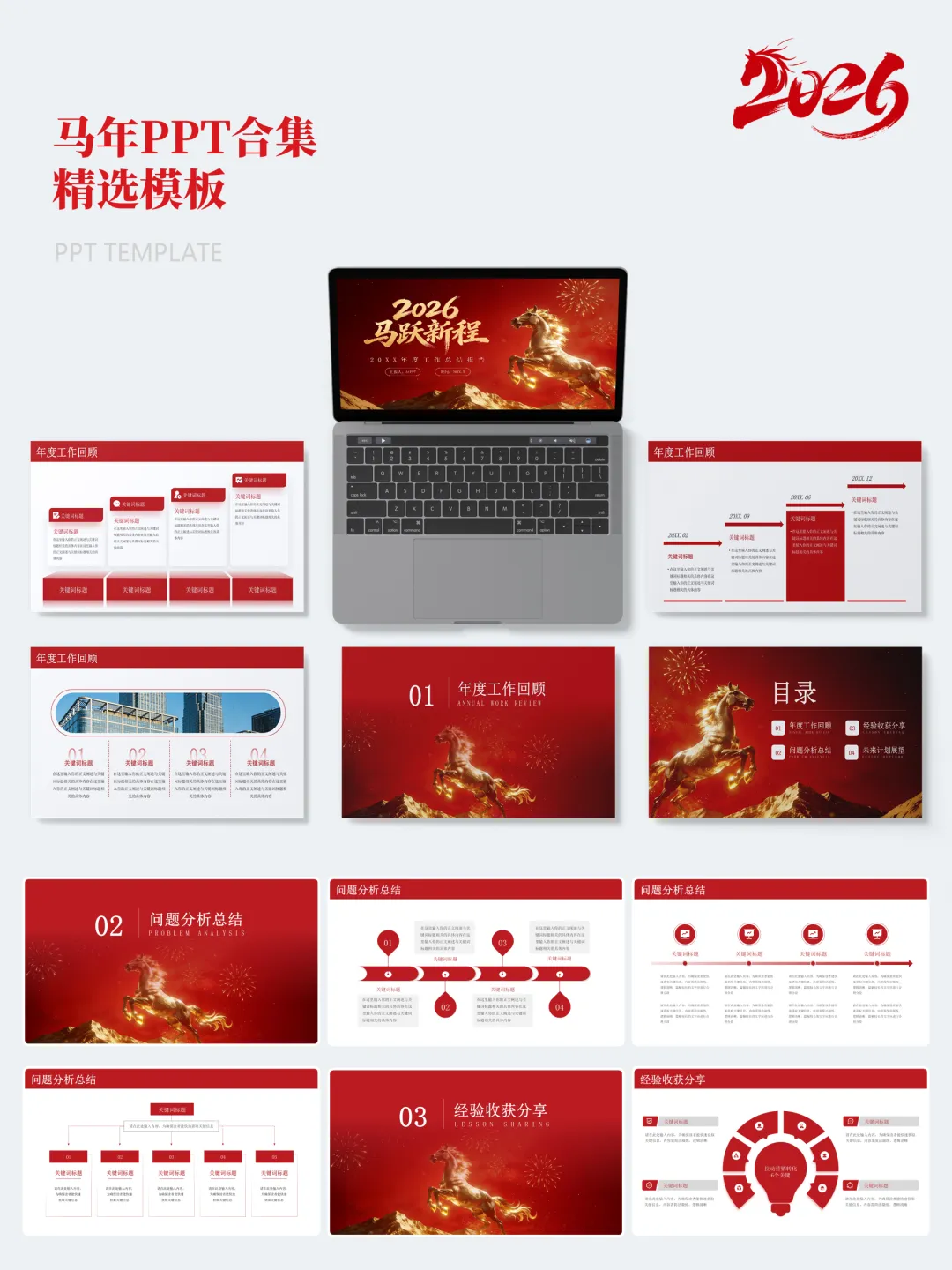 本次分享的模板合集共包含15套马年主题PPT,涵盖年度总结、述职汇报、年会活动、新春企划等多个应用场景。整体设计以红金、白金为主色调,辅以马年元素、传统纹样及现代几何图形,既体现节日氛围,又保持正式场合所需的庄重与严谨。