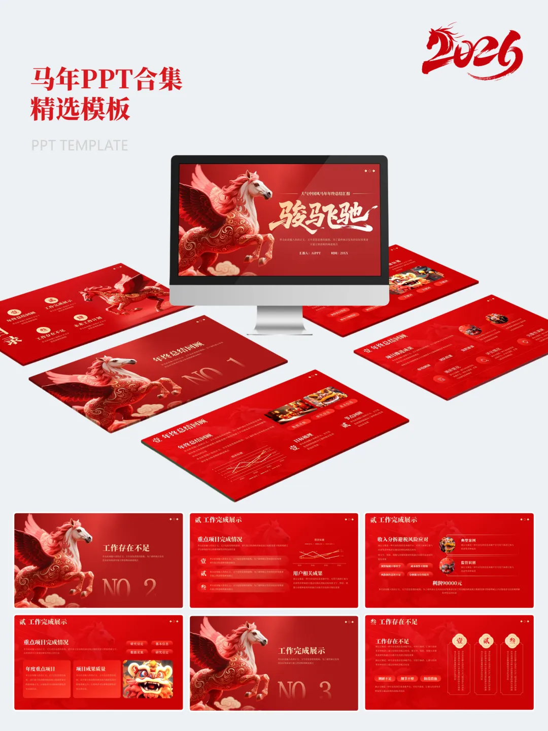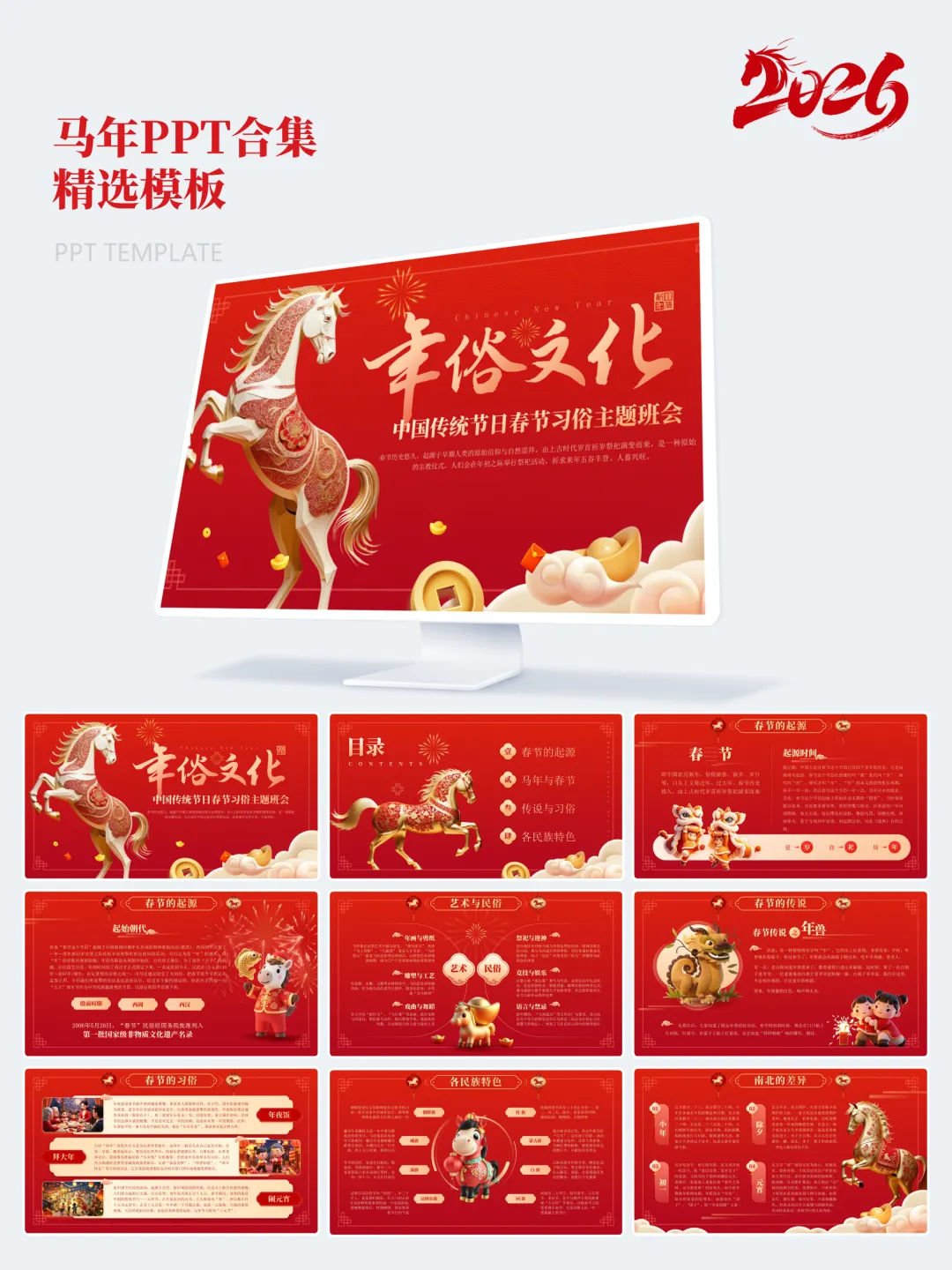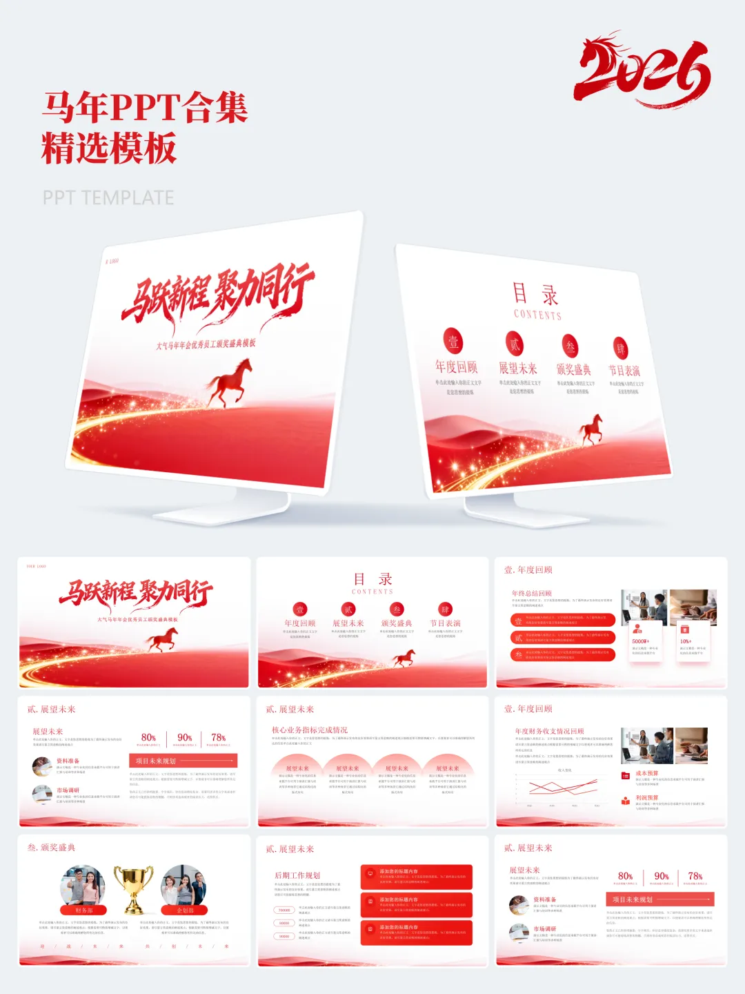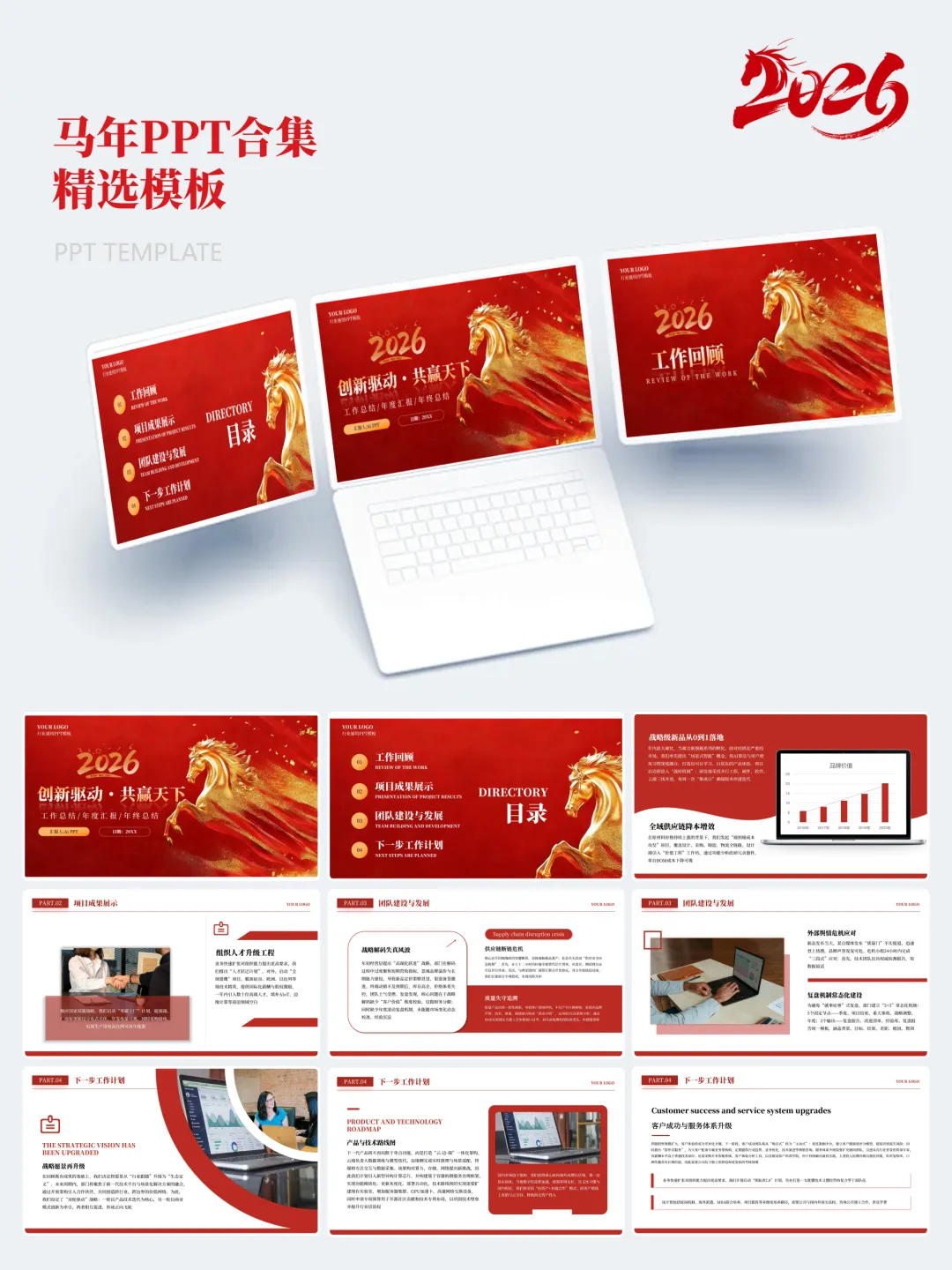 本次分享的模板合集共包含15套马年主题PPT,涵盖年度总结、述职汇报、年会活动、新春企划等多个应用场景。整体设计以红金、白金为主色调,辅以马年元素、传统纹样及现代几何图形,既体现节日氛围,又保持正式场合所需的庄重与严谨。