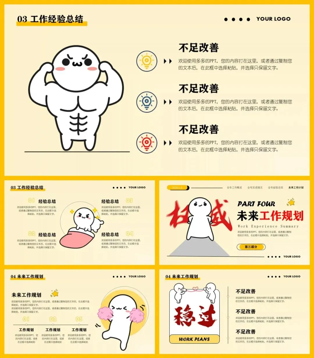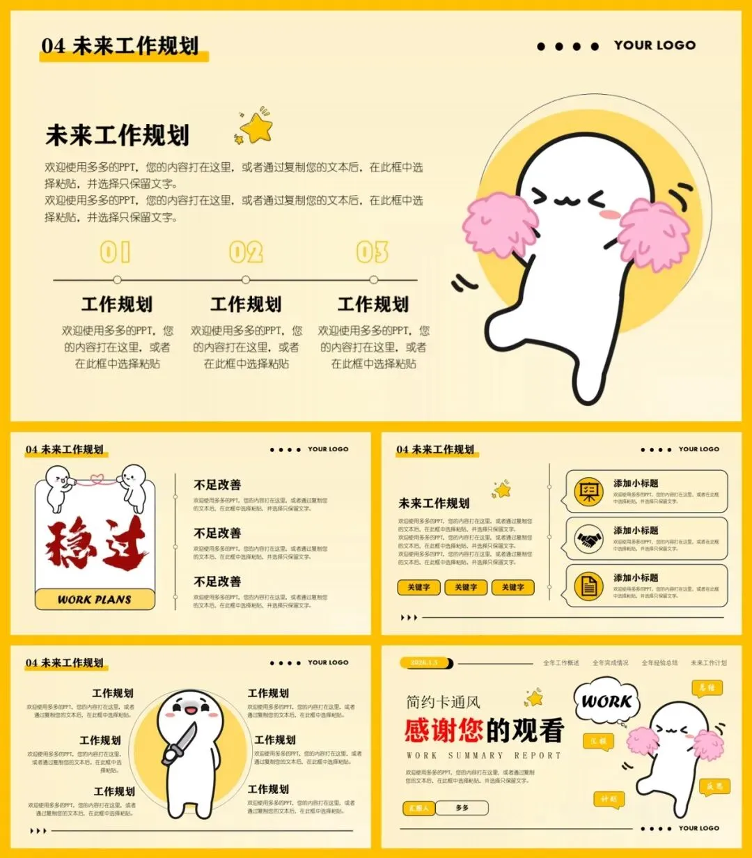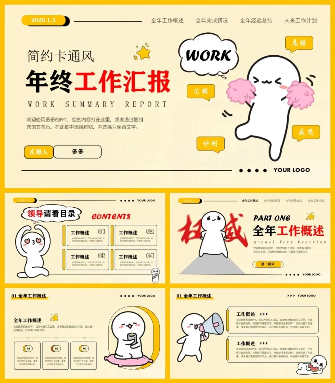 这款卡通风格的年度工作总结PPT模板,用轻松活泼的视觉语言,把你的成果和亮点生动呈现。