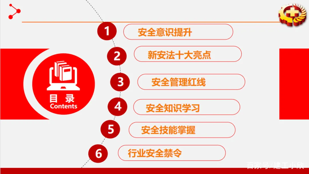 这是一个关于安全生产的PPT案例。原先的幻灯片上,不仅在目录标题上套上一些很无聊的圆角矩形,还把正文页的标题栏也搬了过来,整个页面看起来混乱不堪。为此我们把多余的线框和色块都删掉,并加上上张表示工人安全生产的照片形成蒙版,既简洁又能清晰地看到目录的内容。