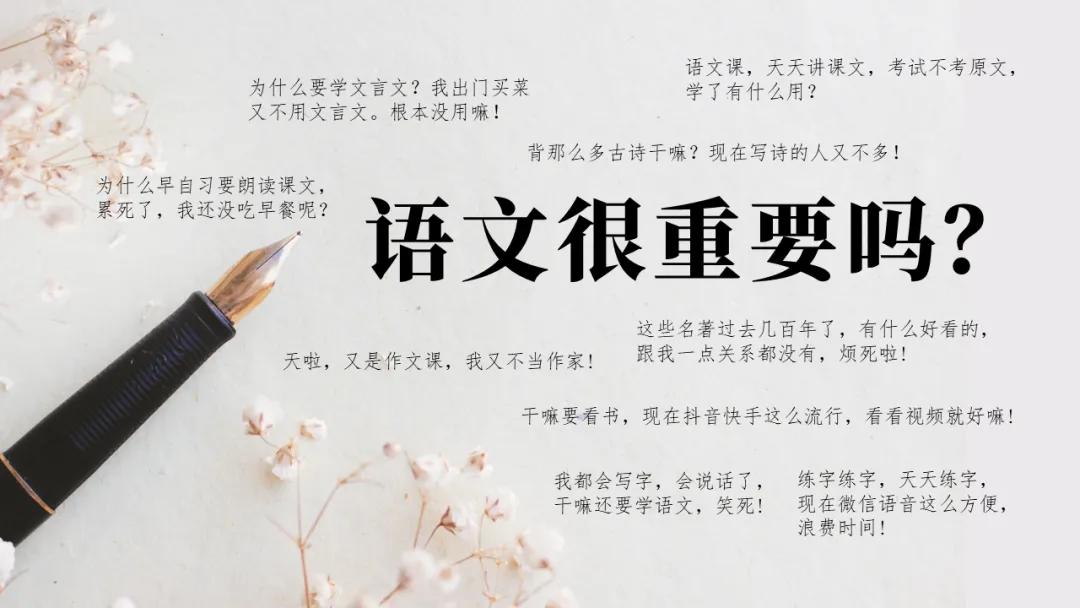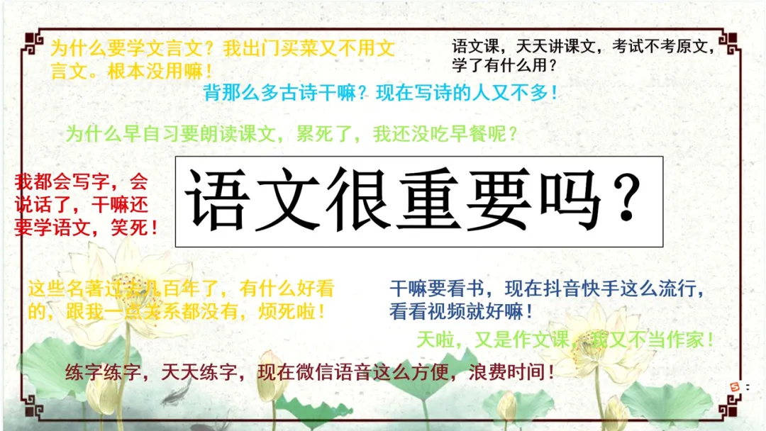 这个案例是一位中学语文老师在开学第一课上的概述,围绕着「语文很重要吗」这个大标题的,是一堆杂乱无章的代表学生想法的文字。这些五颜六色的文字,说不定真的让学生觉得语文不重要。所以,修改时我们更倾向于通过字体的差异来突出「重要」。
