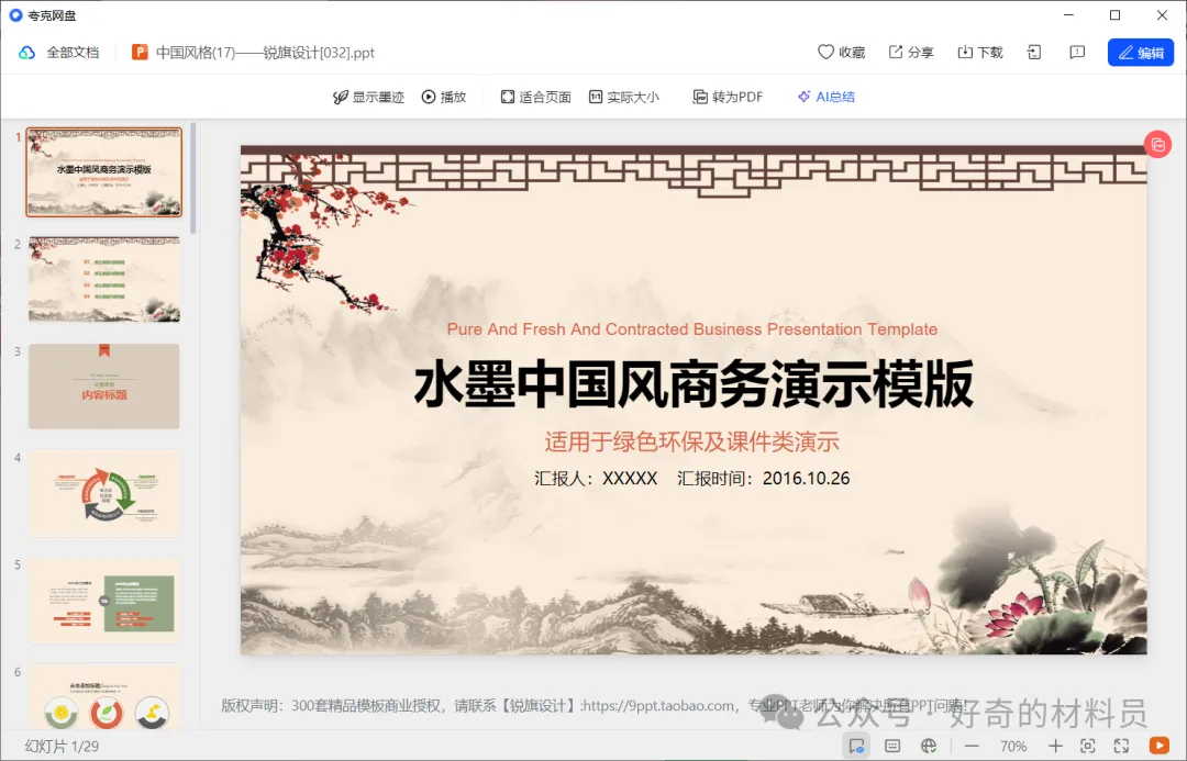 前面给大家分享的都是商务办公、工作总结、星空风格、动漫治愈系的PPT模板,今天给大家带来了国风舒心系列的模板,小编觉得这个系列的风格和排版看着都挺舒心的,这次给大家分享了有29套,可以先收藏一波,需要的时候可以直接下载使用。后面小编会一直给大家分享各类有用的模板和资源,希望大家喜欢!!!!