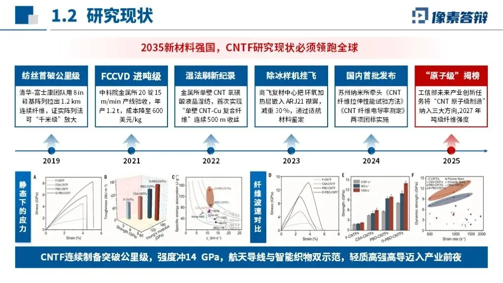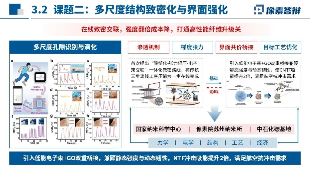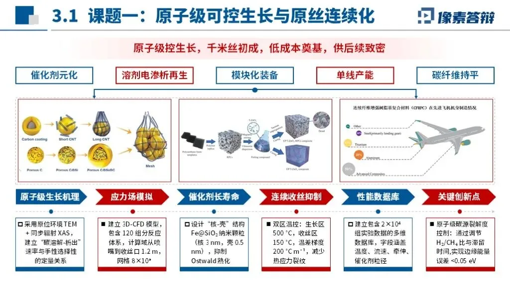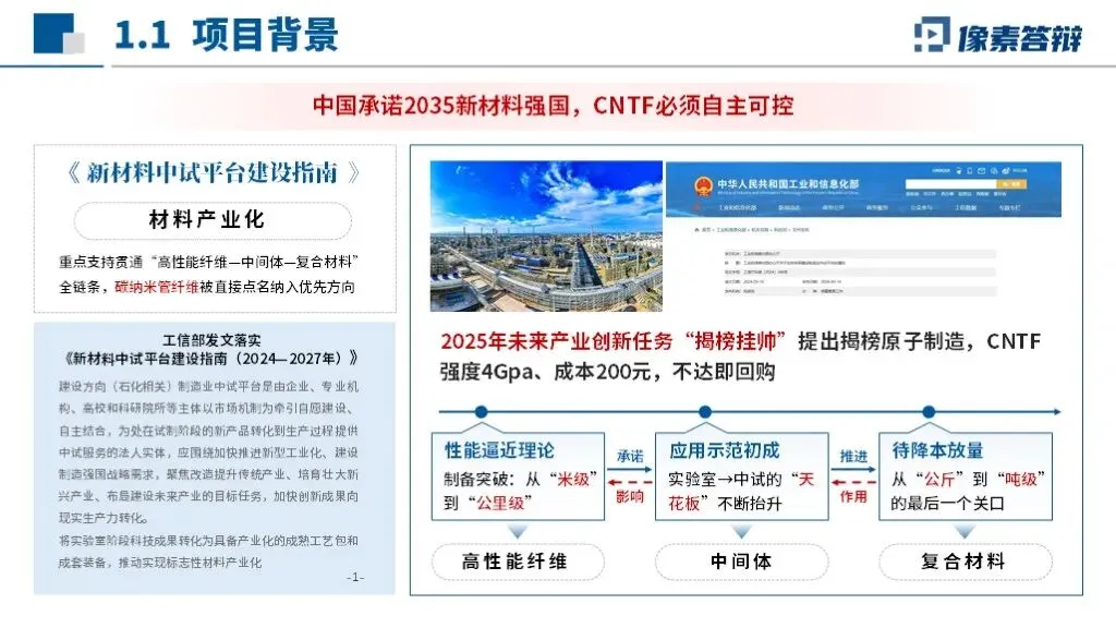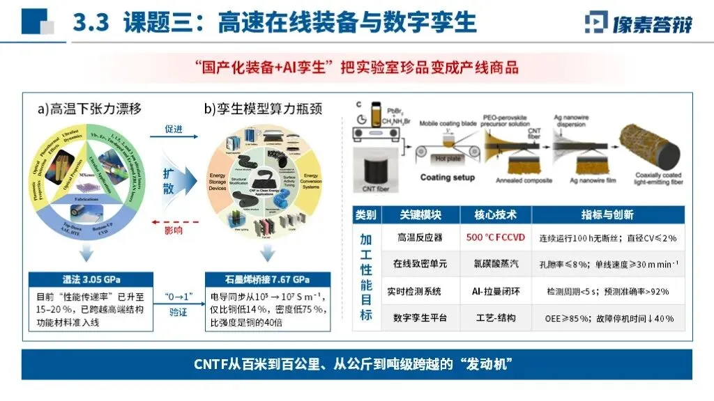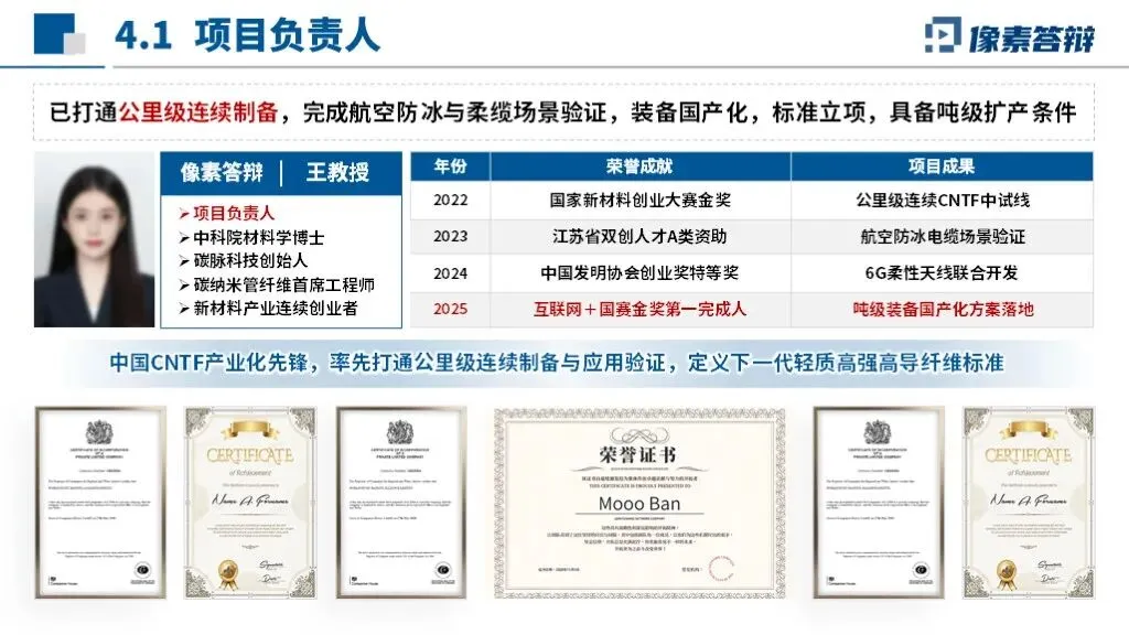 PPT采用“国家需求-技术瓶颈-产业链条-成果落地”闭环框架,以碳纳米管纤维自主可控为核心,贯穿材料制备、装备开发、应用验证全链条,凸显从实验室研究到产业化的系统性布局。