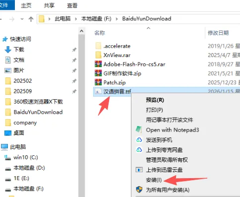 2、下载好“汉语拼音.ttf ”字体文件后,在字体文件上右击,选择右键菜单中的“安装”将字体安装到系统中。