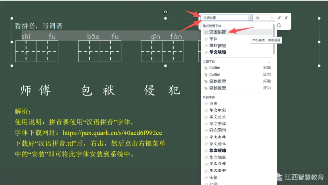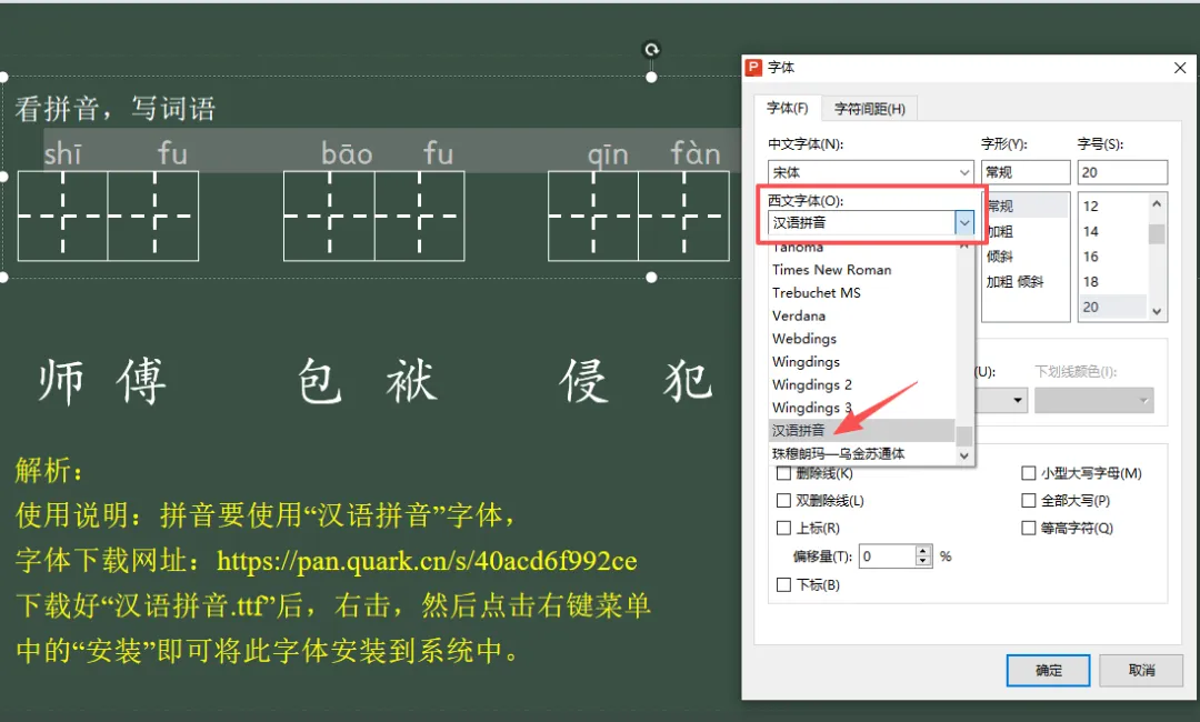 1、下载:拼音字母要使用“汉语拼音”字体,字体下载网址:https://pan.quark.cn/s/40acd6f992ce
