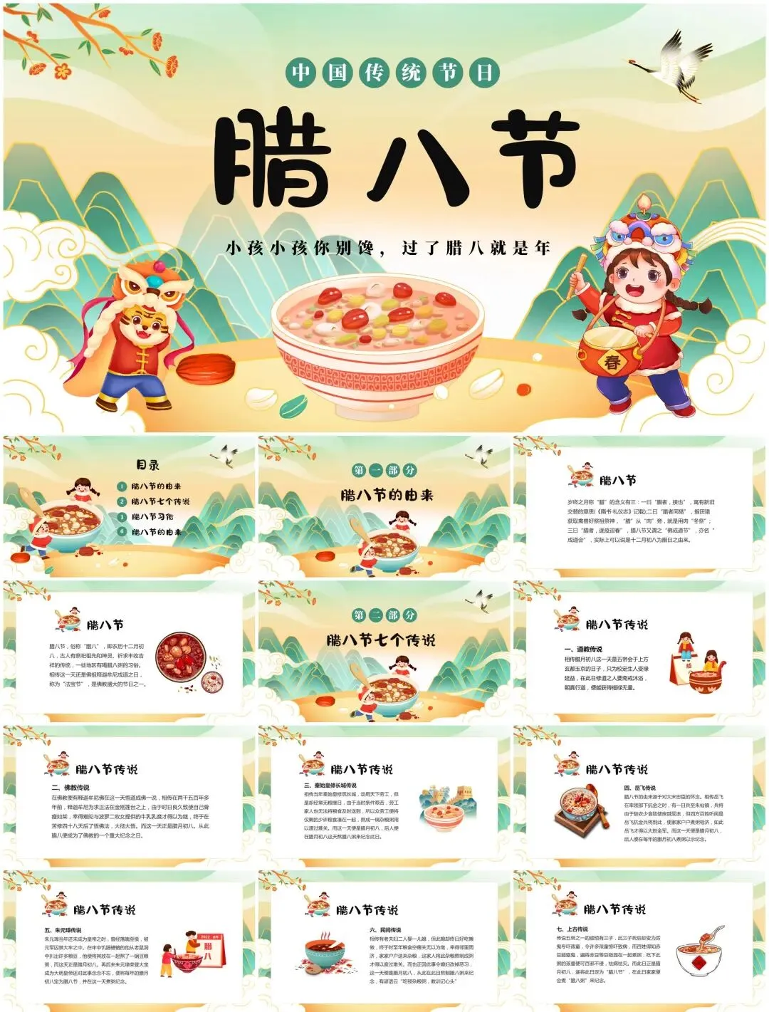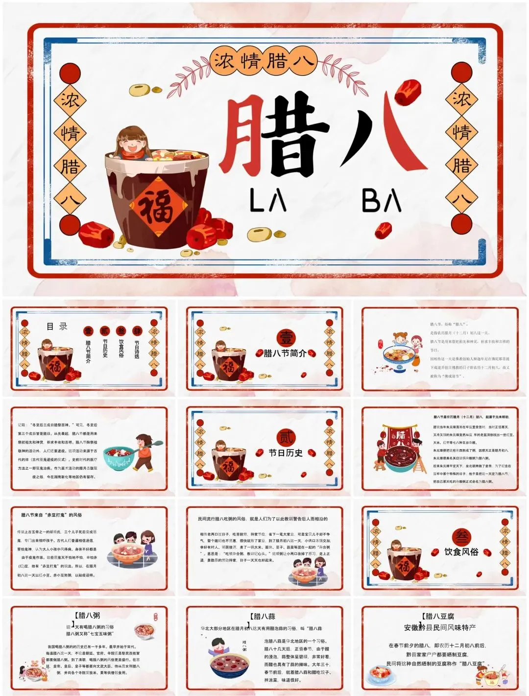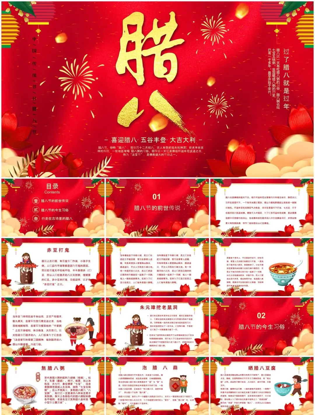 从腊八粥食材拆解动效到寺庙布施场景插画,从南北习俗对比信息图到年味倒计时交互设计——这套【民俗文化模板】用陶罐纹理、谷物粒子等元素,打造可"品尝"的视觉盛宴。