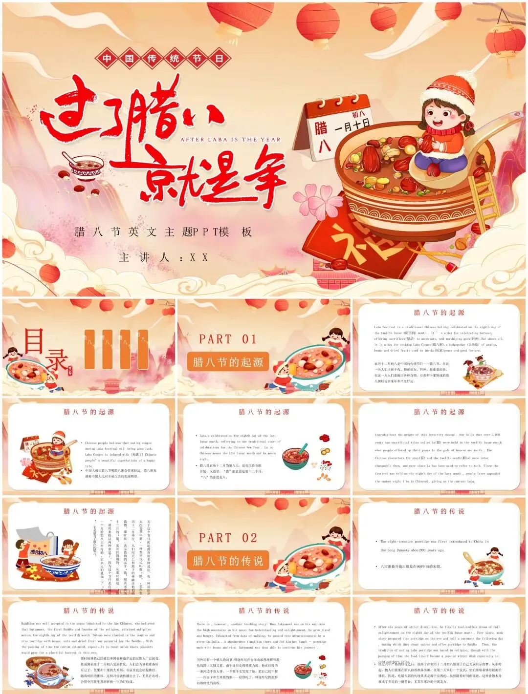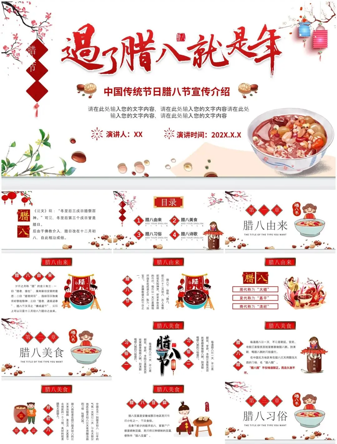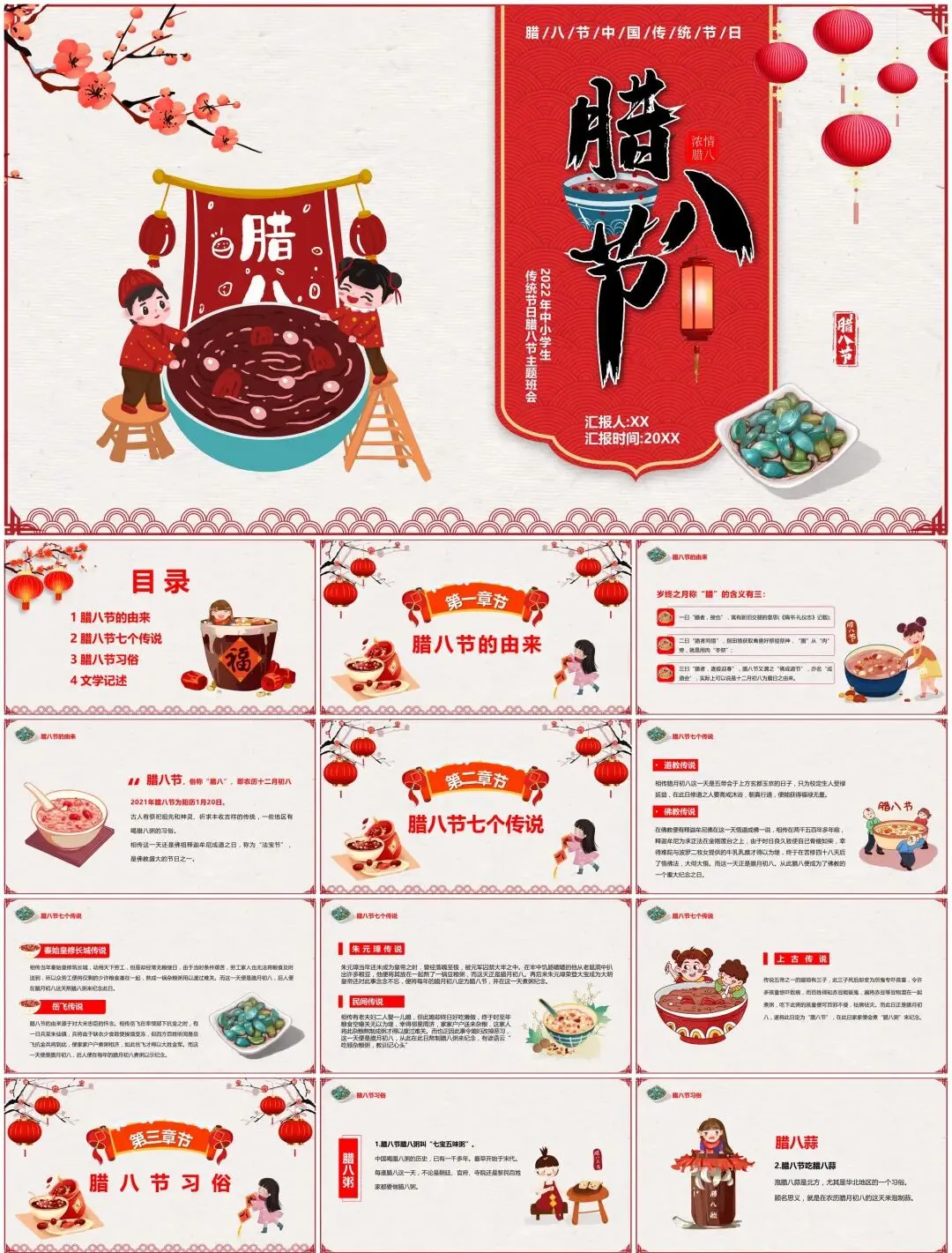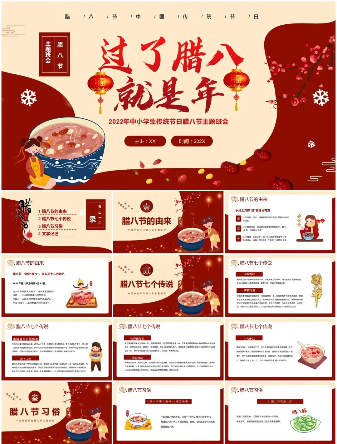 从腊八粥食材拆解动效到寺庙布施场景插画,从南北习俗对比信息图到年味倒计时交互设计——这套【民俗文化模板】用陶罐纹理、谷物粒子等元素,打造可"品尝"的视觉盛宴。