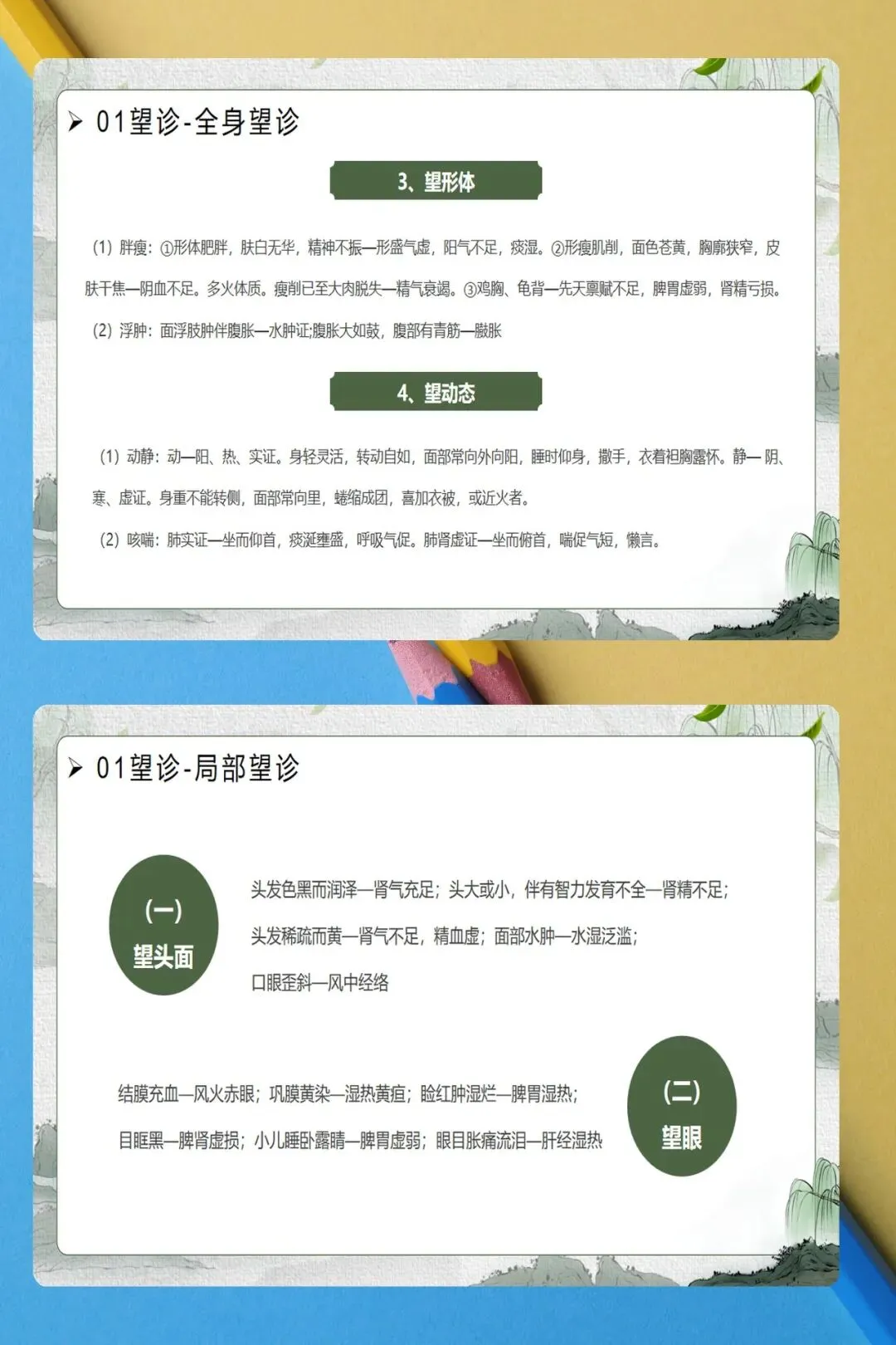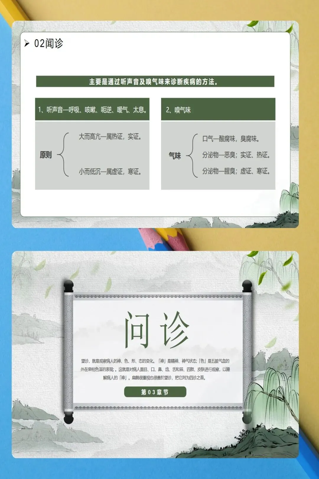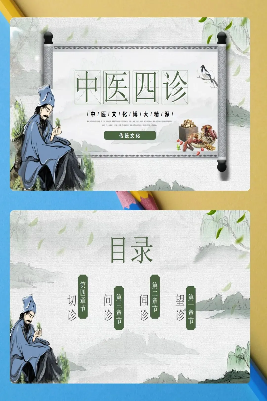 中医四诊(望闻问切)是传统中医诊断的核心智慧,不用复杂仪器,通过观察面色、倾听声音、询问症状、触摸脉象,就能判断身体气血虚实!这份中医四诊入门PPT模板,把望神、望色、听咳嗽、问寒热、切脉象等核心内容,用通俗易懂的方式拆解。不管是想了解中医诊断逻辑,还是日常自查健康状态,都能直接用——从面色发白看气血不足,从舌苔黄腻辨湿热内蕴,从脉象浮数知外感风热,全给你讲得明明白白,赶紧收藏起来,做自己的健康小管家!