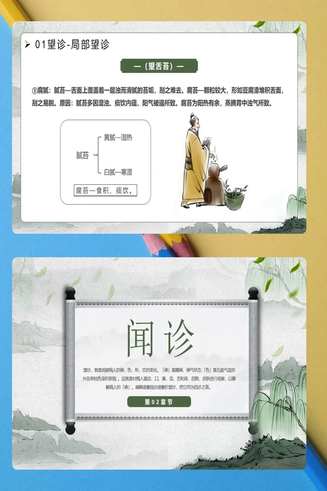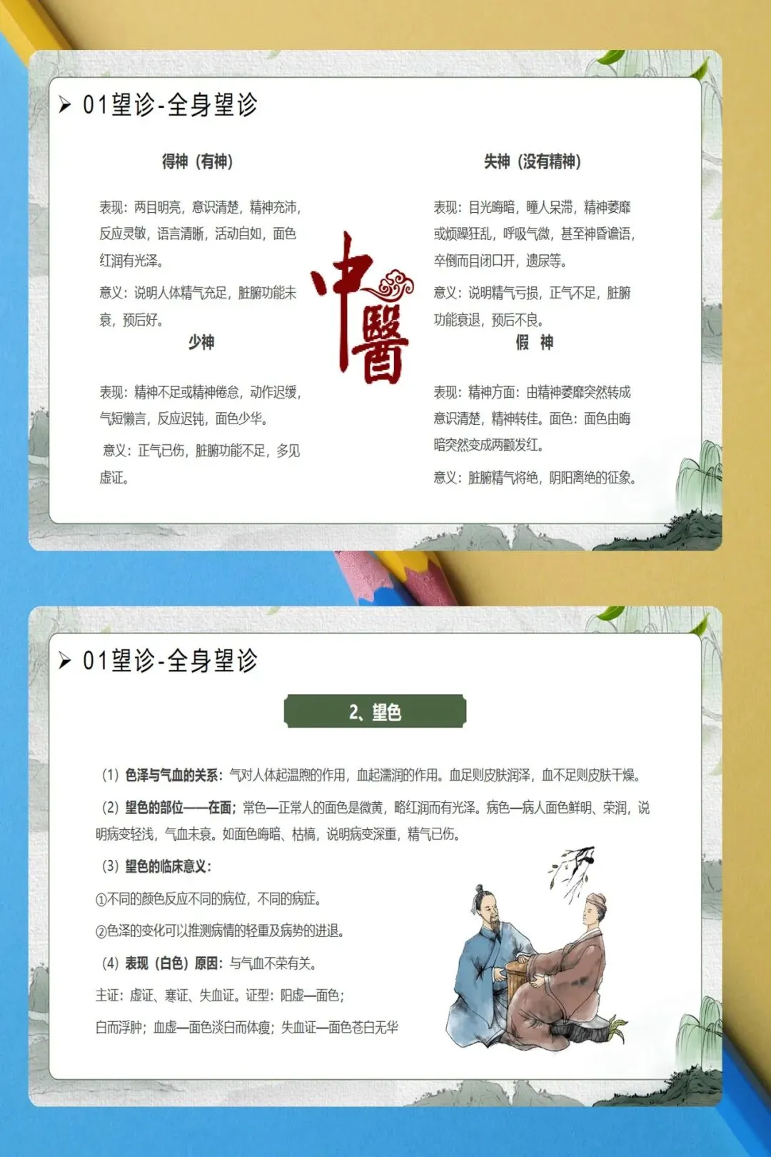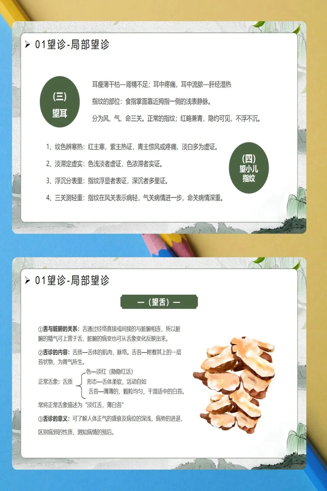 中医四诊(望闻问切)是传统中医诊断的核心智慧,不用复杂仪器,通过观察面色、倾听声音、询问症状、触摸脉象,就能判断身体气血虚实!这份中医四诊入门PPT模板,把望神、望色、听咳嗽、问寒热、切脉象等核心内容,用通俗易懂的方式拆解。不管是想了解中医诊断逻辑,还是日常自查健康状态,都能直接用——从面色发白看气血不足,从舌苔黄腻辨湿热内蕴,从脉象浮数知外感风热,全给你讲得明明白白,赶紧收藏起来,做自己的健康小管家!