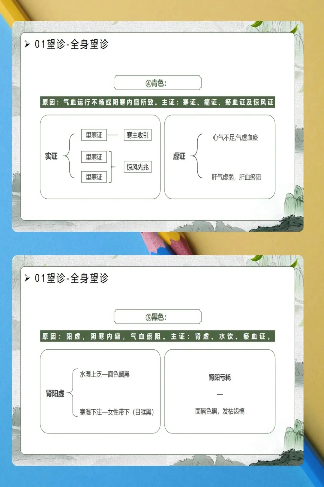 青色:主寒证、痛证、瘀血证、惊风证,如寒证面色青黑、瘀血证面色青紫