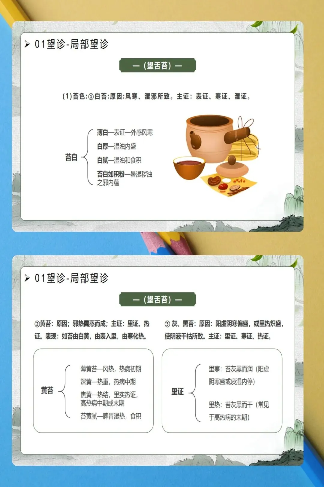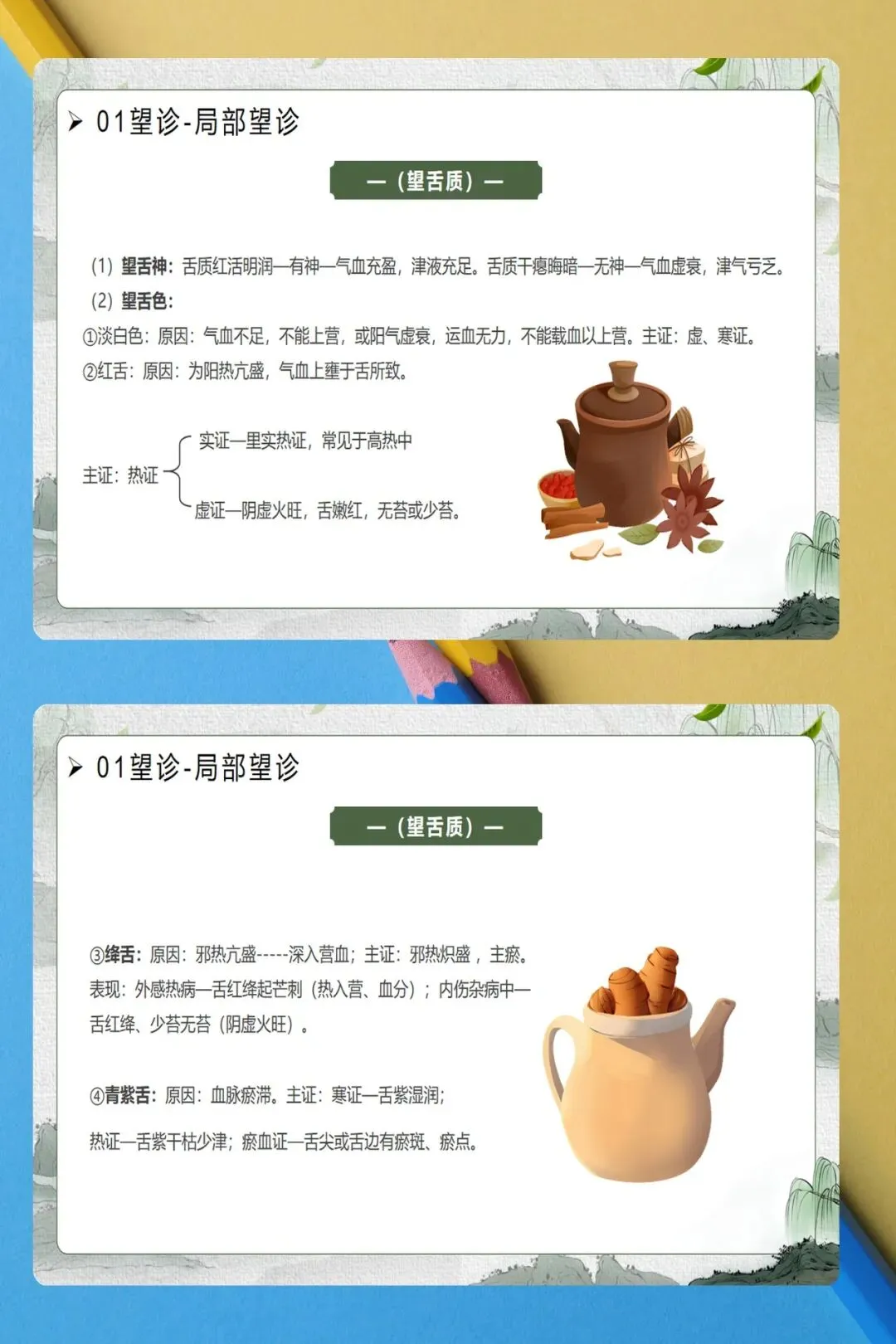 舌诊:正常舌象为“淡红舌,薄白苔”;舌质淡白主虚寒证,舌红主热证;苔白主表证寒证,苔黄主里证热证