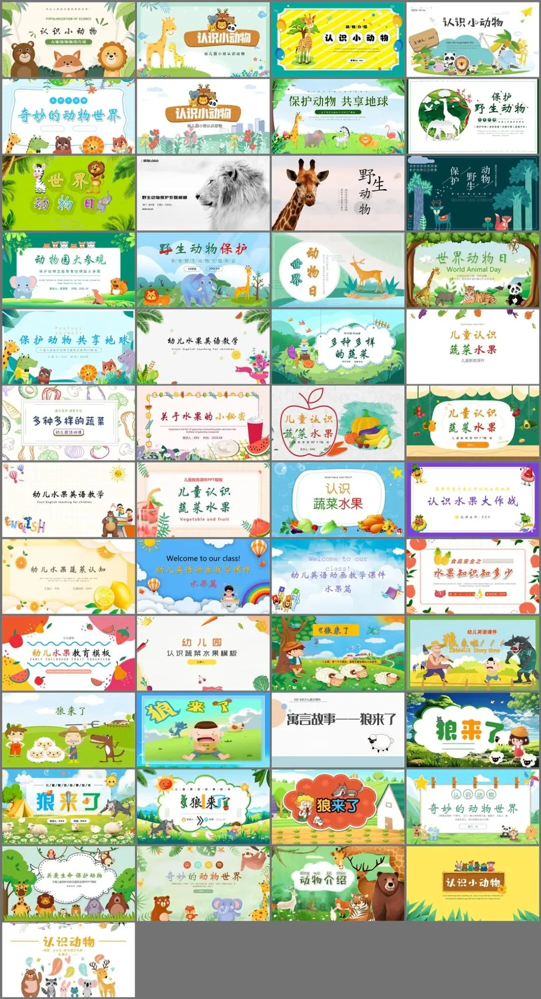 包括了:认识小动物PPT、奇妙的动物世界PPT、保护野生动物PPT、世界动物日PPT、野生动物PPT、多种多样的蔬菜PPT、水果知识知多少PPT、狼来了PPT、奇妙的动物世界PPT、动物介绍PPT等。