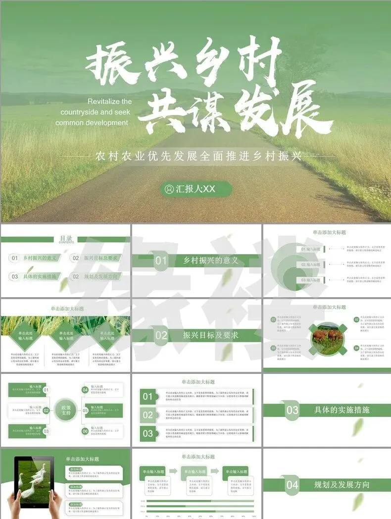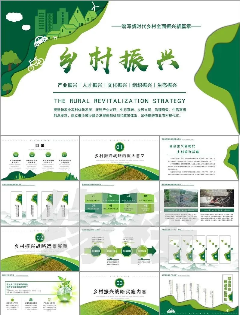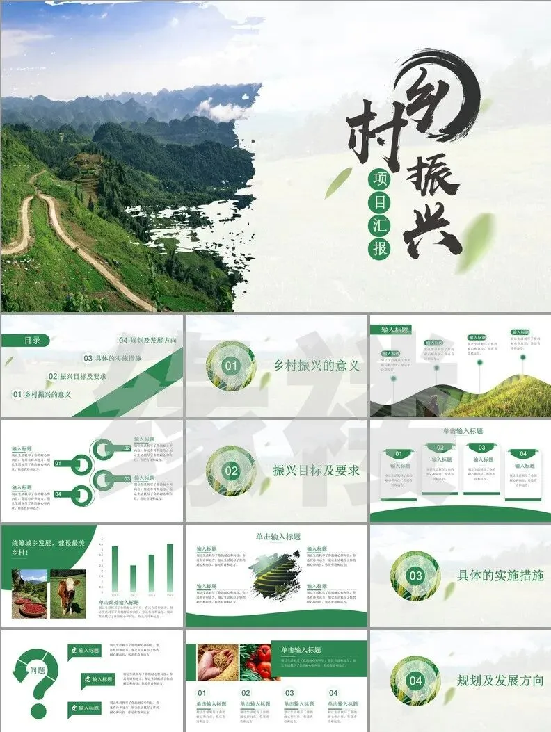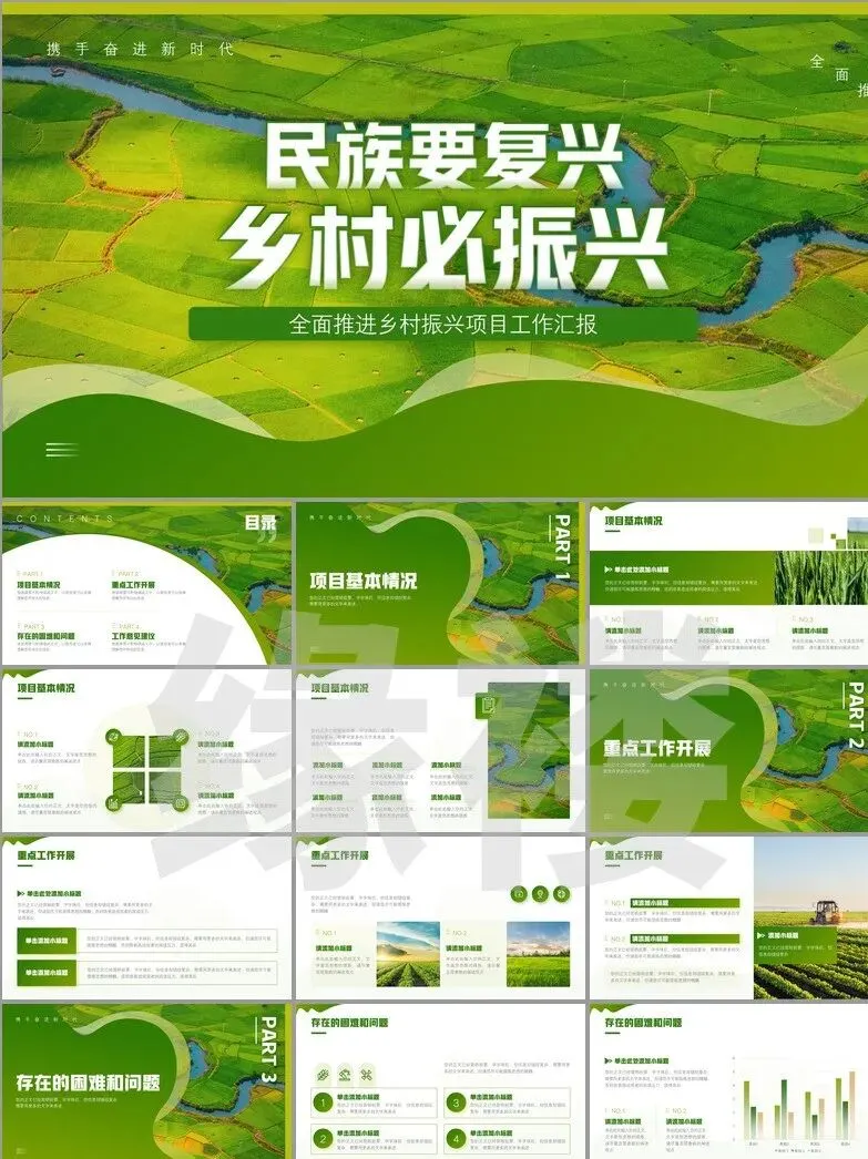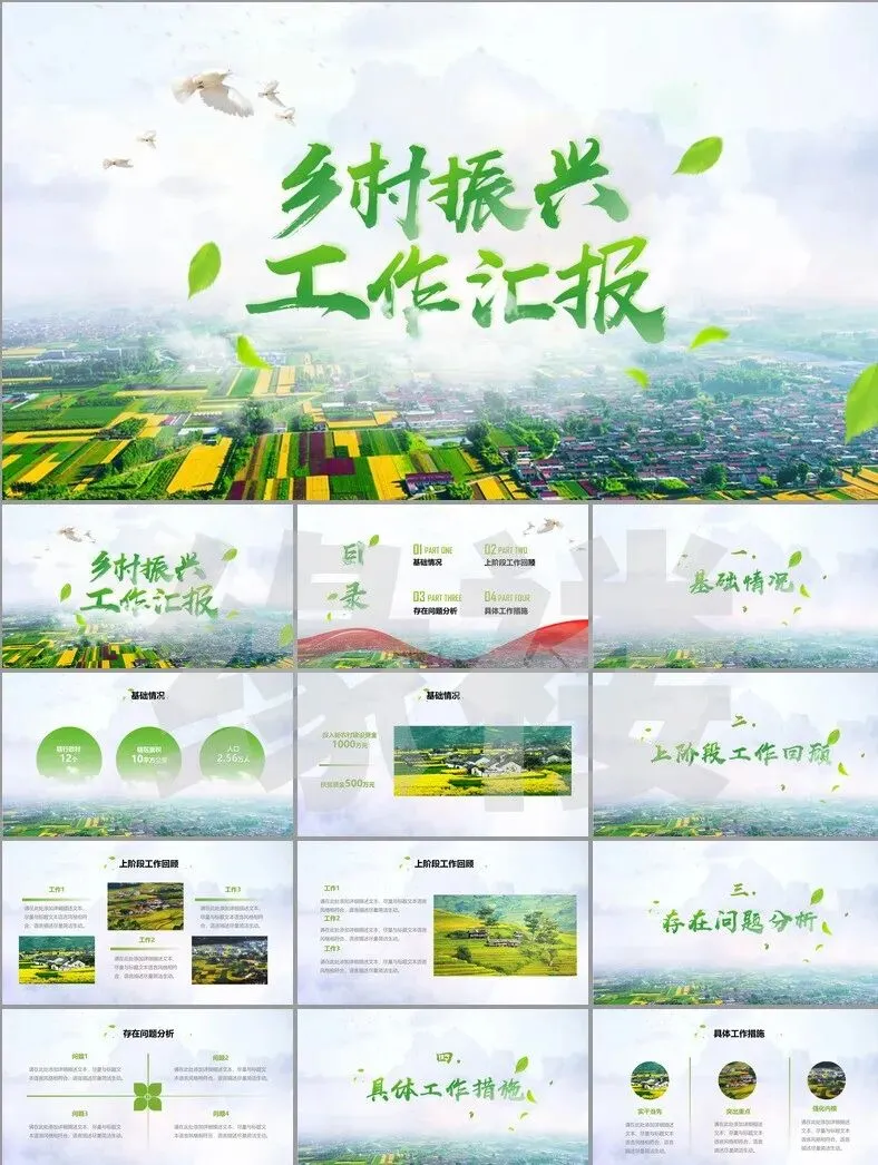 从非遗工坊的3D建模展示到智慧农业大数据看板,从古村落修复对比图谱到乡创IP孵化流程图——这套【振兴专题模板】深度融合二十四节气色卡、农耕元素与现代设计语言,覆盖产业、人才、文化等七大振兴维度。