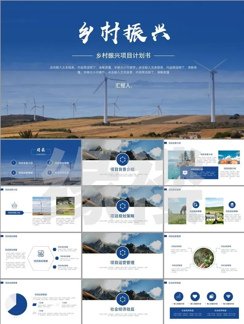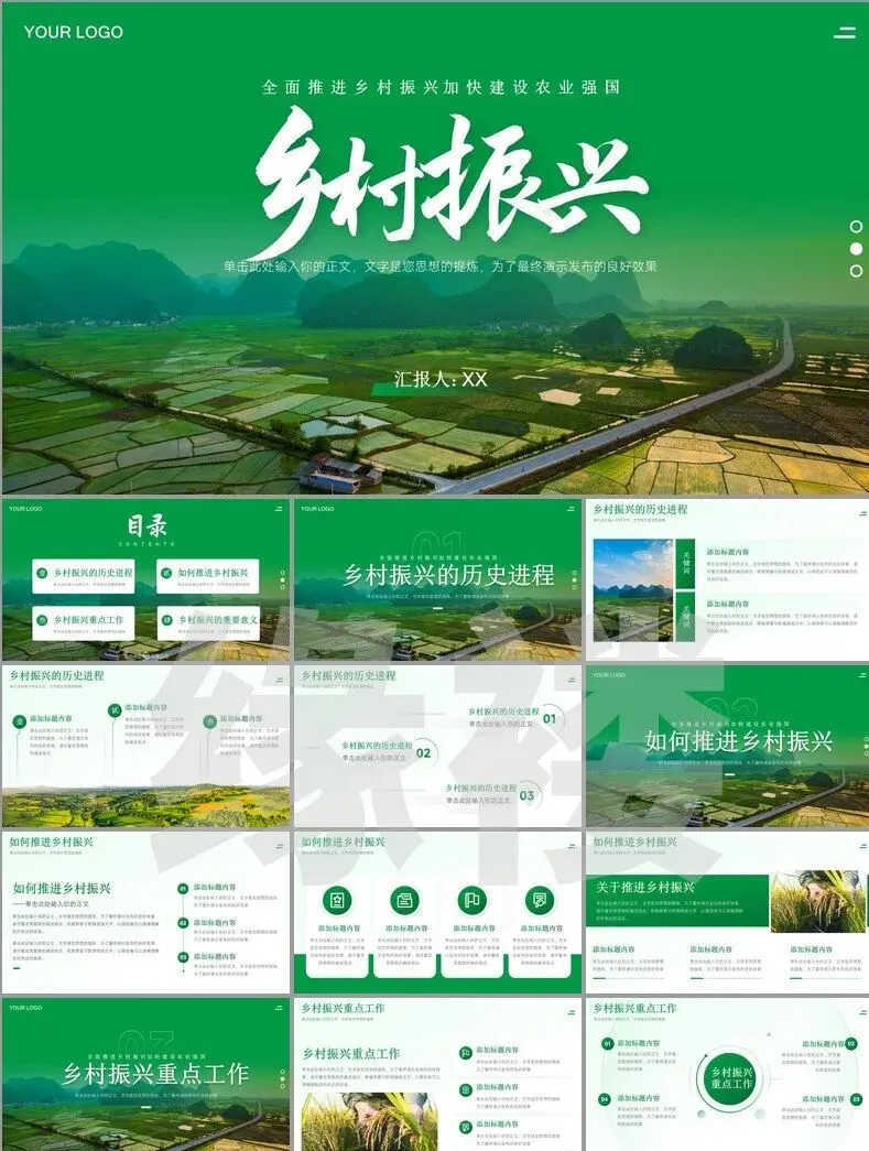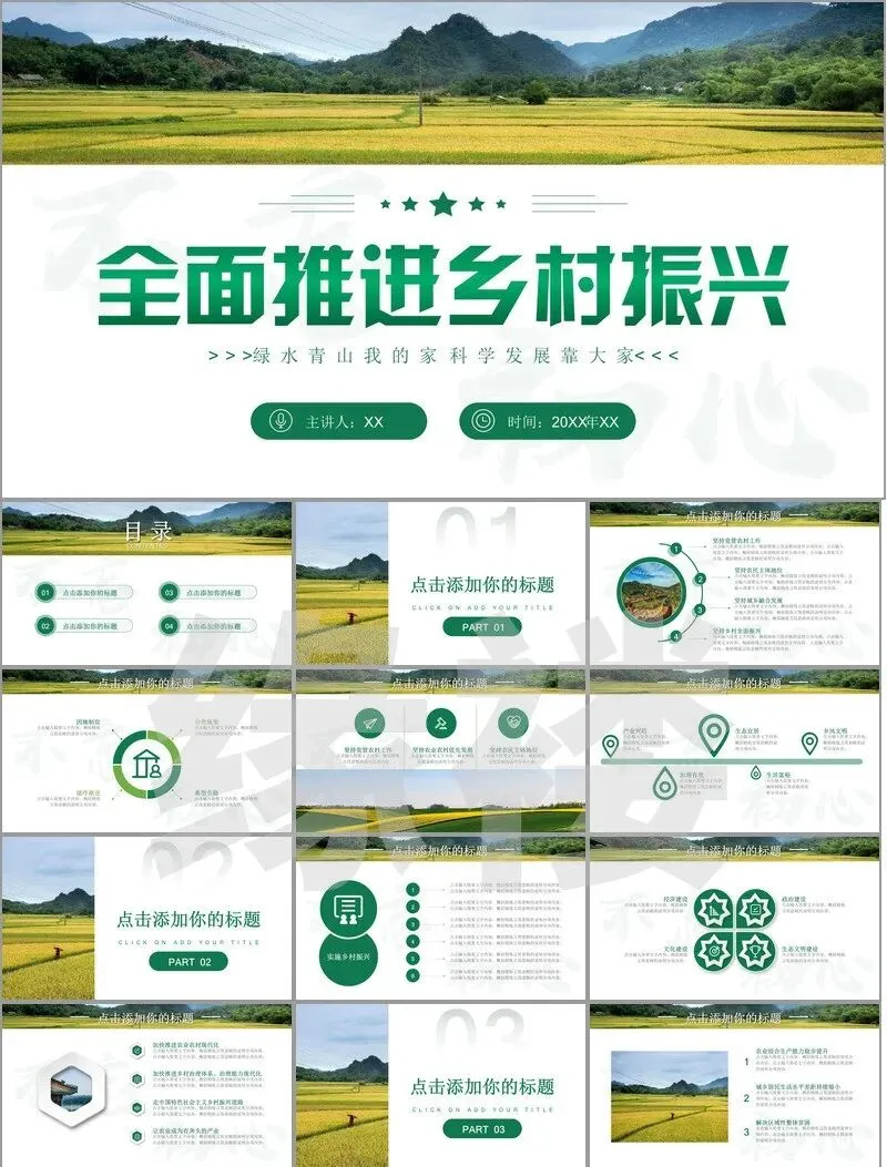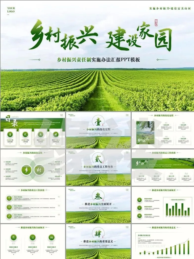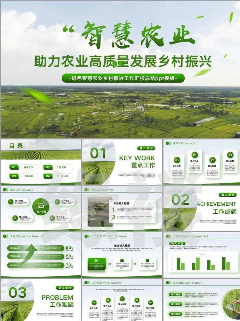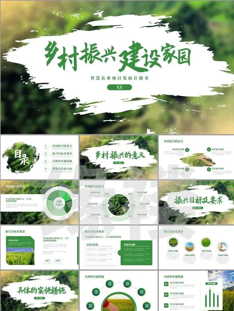 从非遗工坊的3D建模展示到智慧农业大数据看板,从古村落修复对比图谱到乡创IP孵化流程图——这套【振兴专题模板】深度融合二十四节气色卡、农耕元素与现代设计语言,覆盖产业、人才、文化等七大振兴维度。