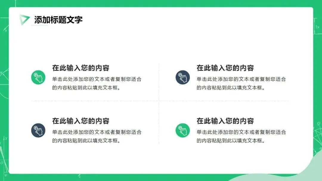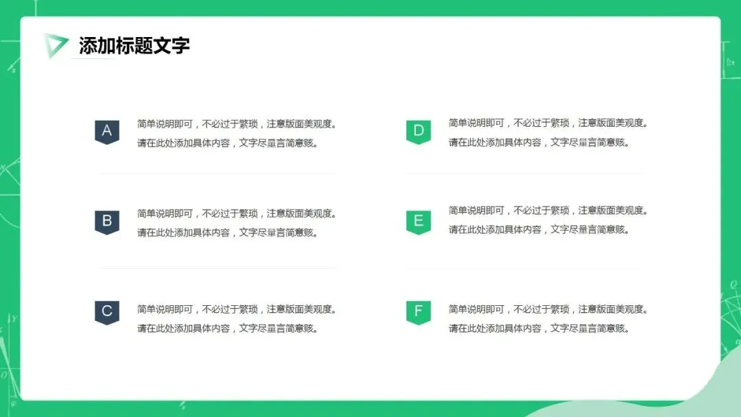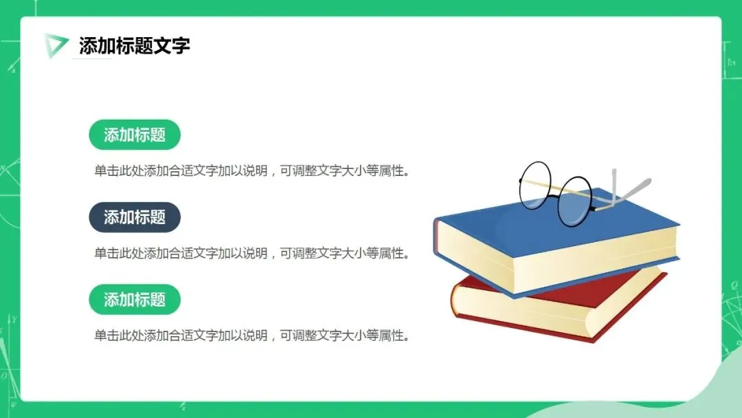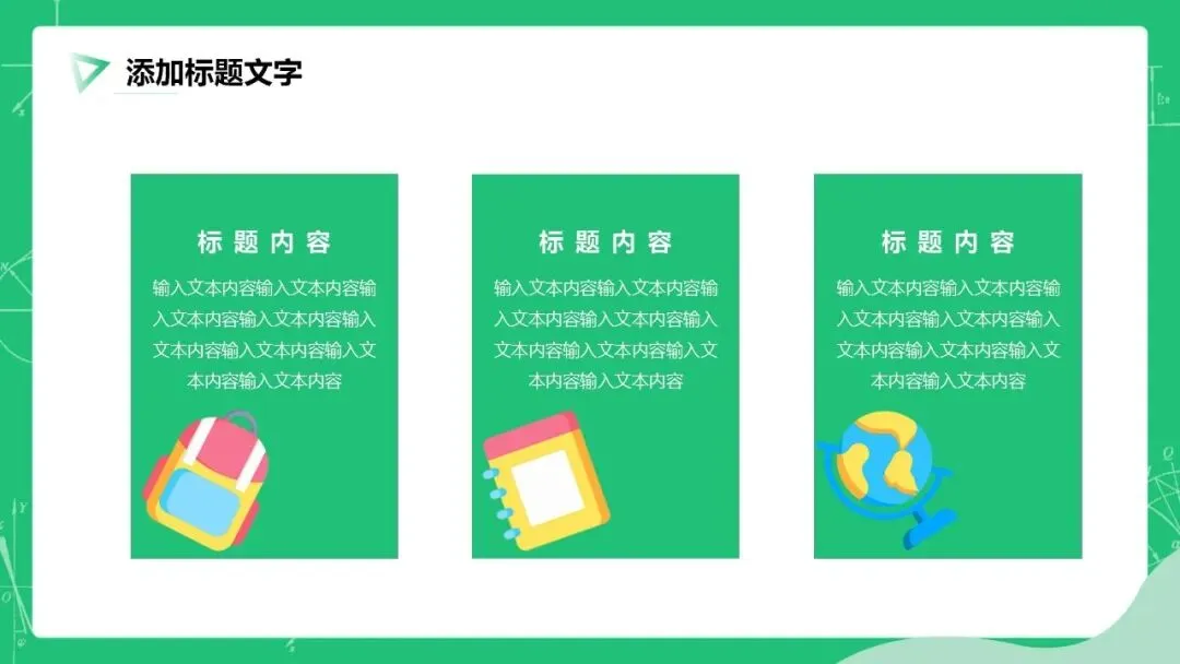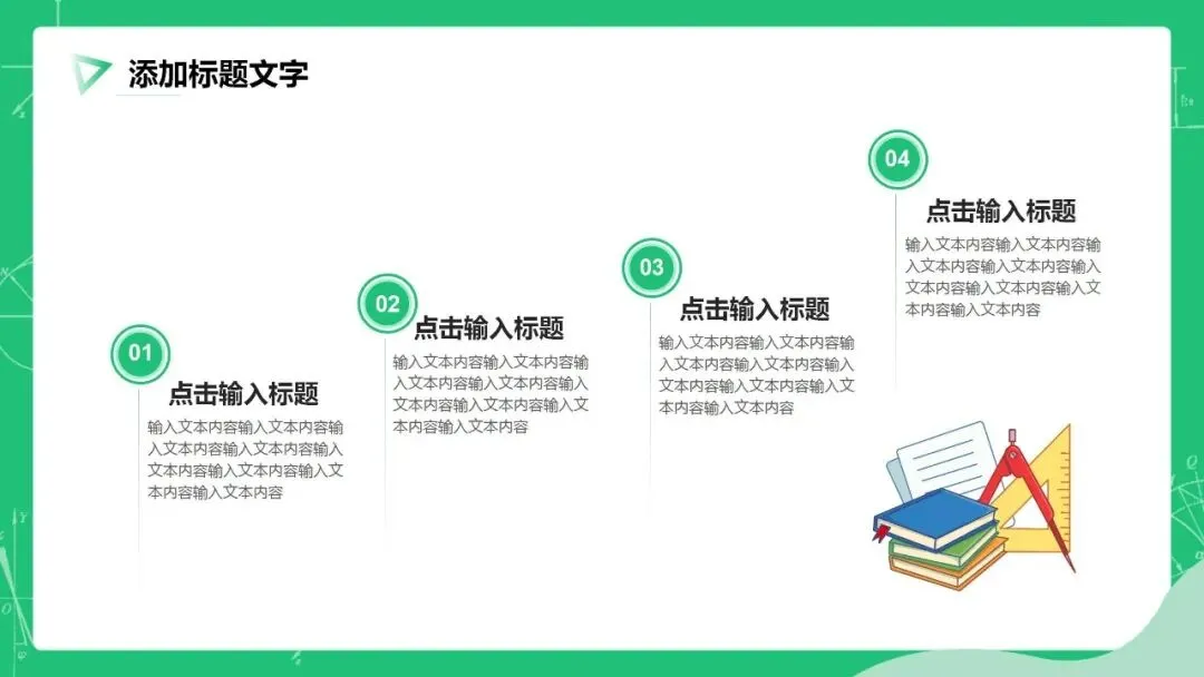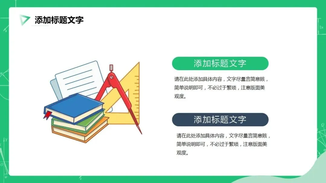 PowerPoint模板内容页,由22张绿色动态幻灯片图表,搭配PPT文字排版组成。另外使用了卡通女老师插图、卡通文具插图等装饰,突出了教学主题。