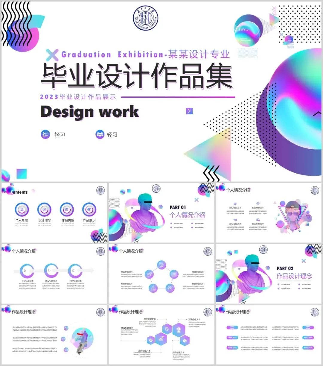 包含了高校专属校徽,100+套精选PPT,正式大气中又不失高级活泼,很能展现个性与品位,适用于各种毕业答辩、总结汇报、活动策划、个人简历、宣传推广等场合。快快收好!求真务实