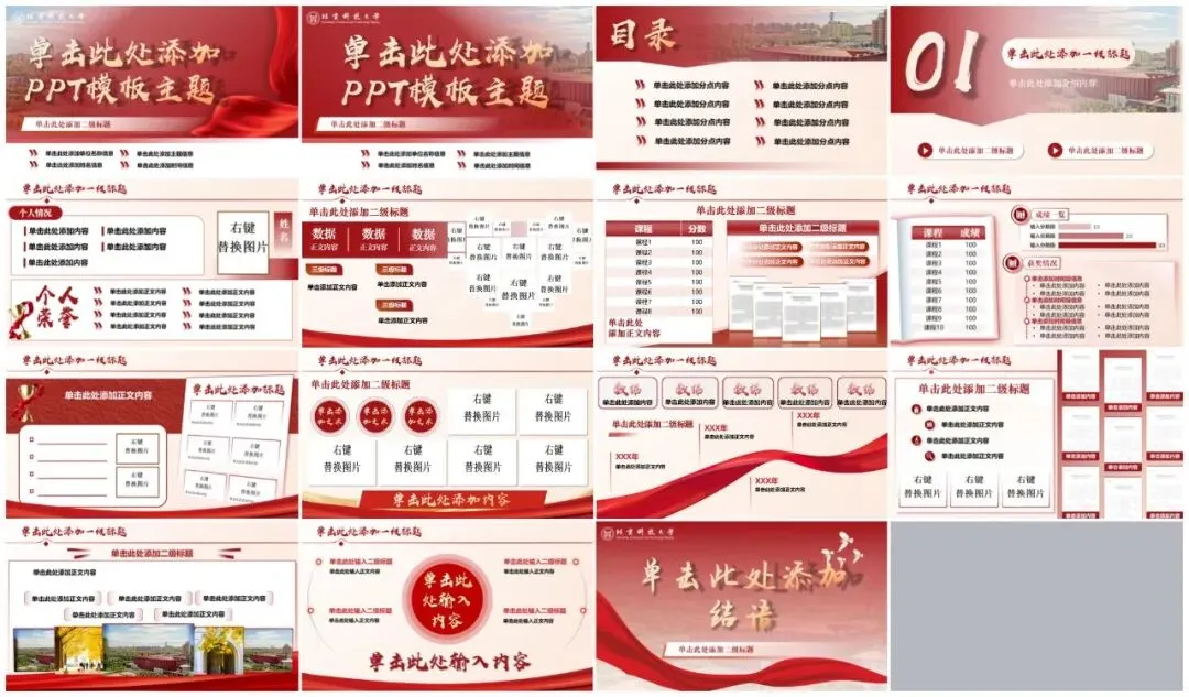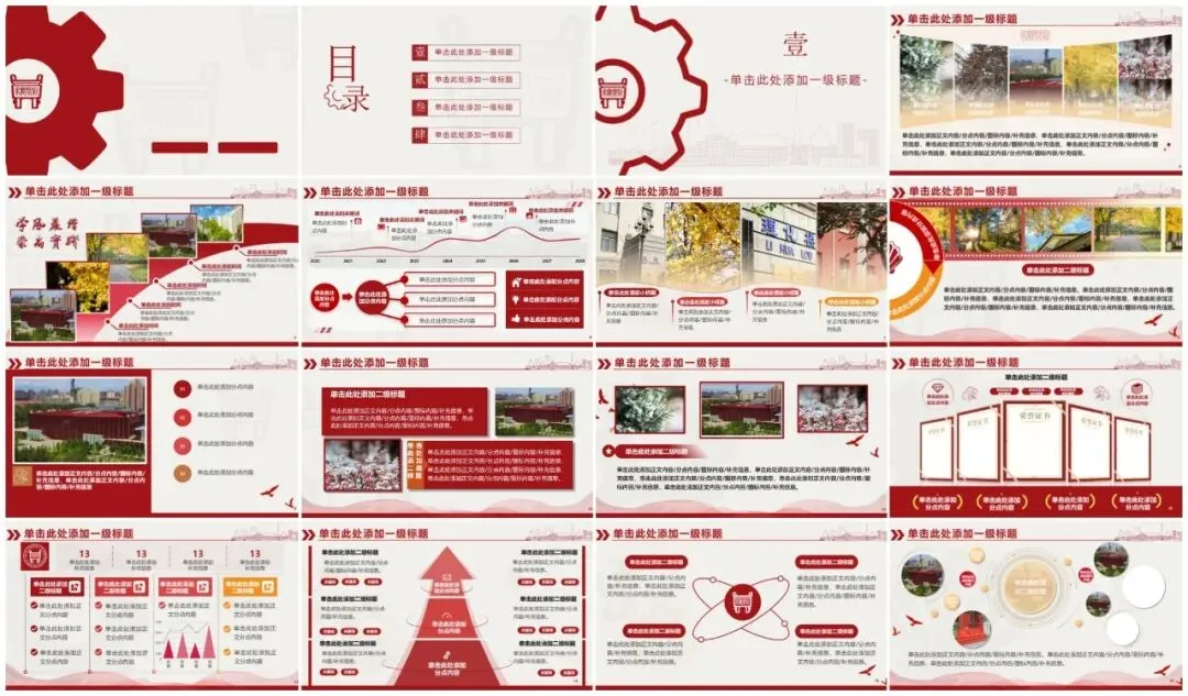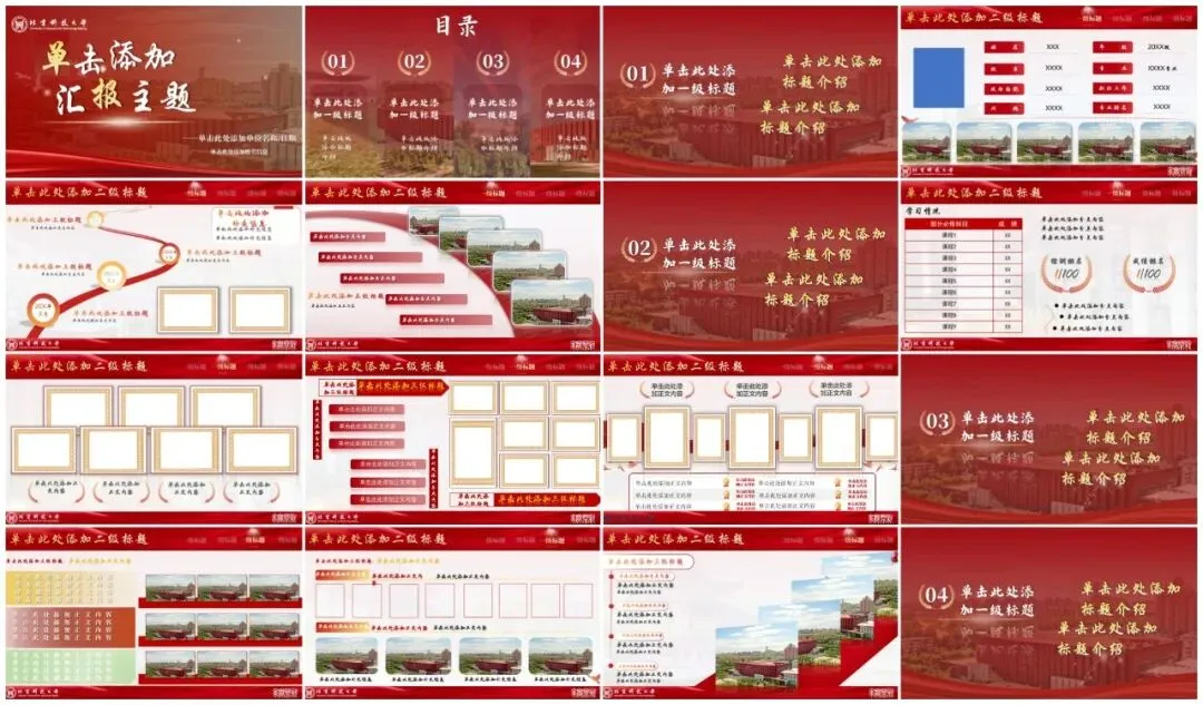 本PPT模板以红色为主题色,结合学校元素展示汇报主题,兼具美观与实用性,适用于各类答辩场景。