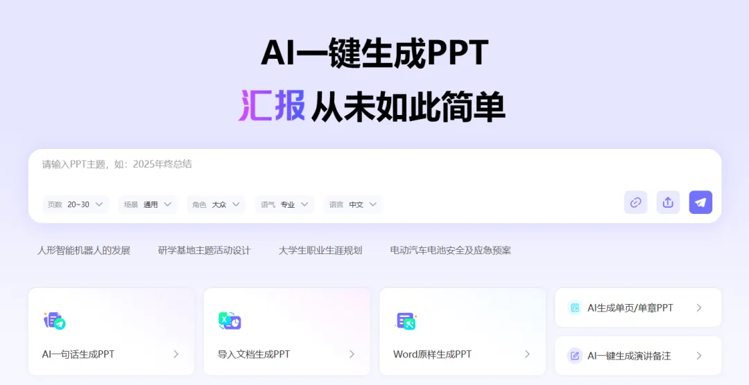操作:上传文档,AI智能识别结构、提炼重点,自动转化为排版精美的PPT