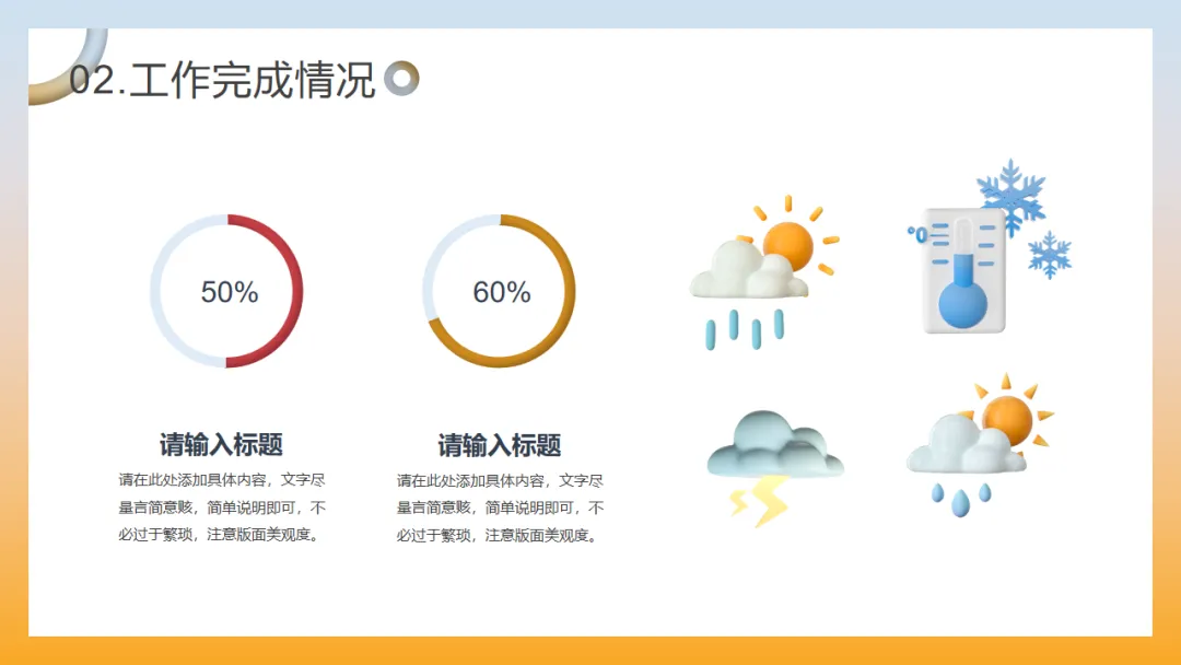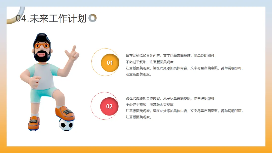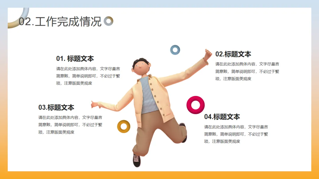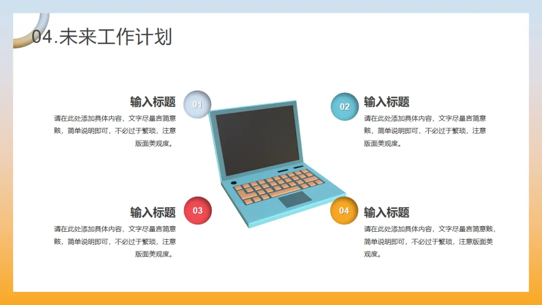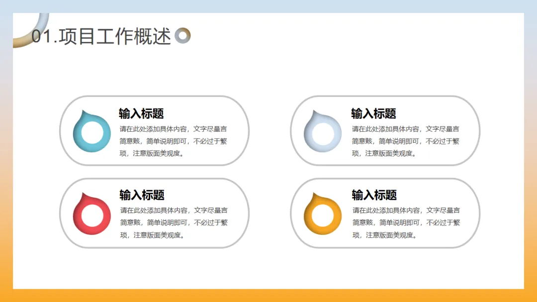 - 逻辑清晰,框架完整预设工作概述 - 成果展示 - 问题分析 - 未来规划四大核心板块,不用再纠结怎么搭框架,直接填内容就能用,汇报思路超顺畅。