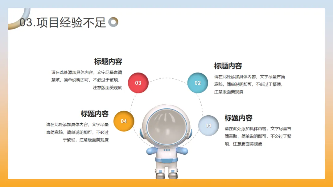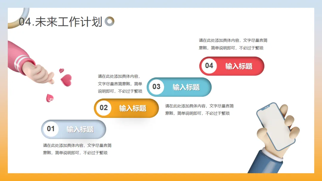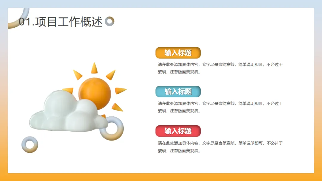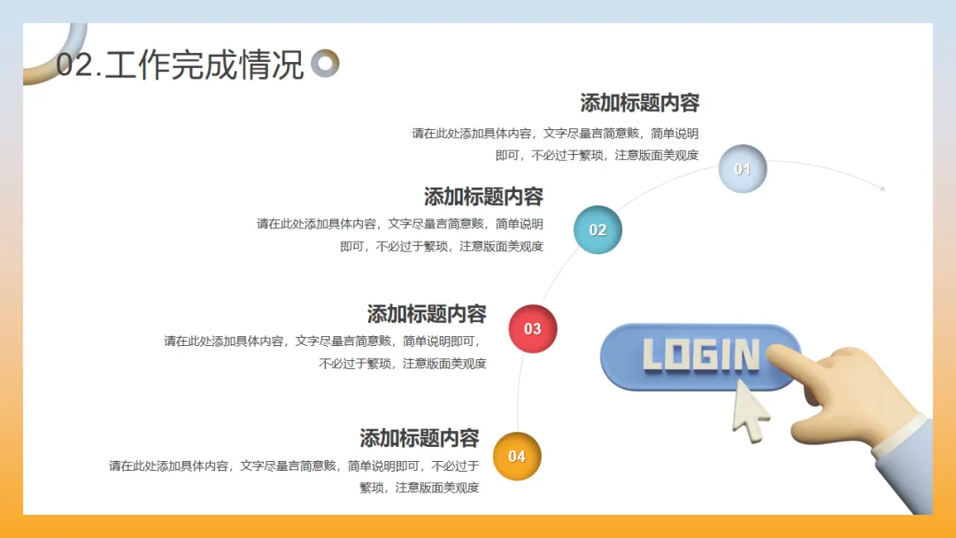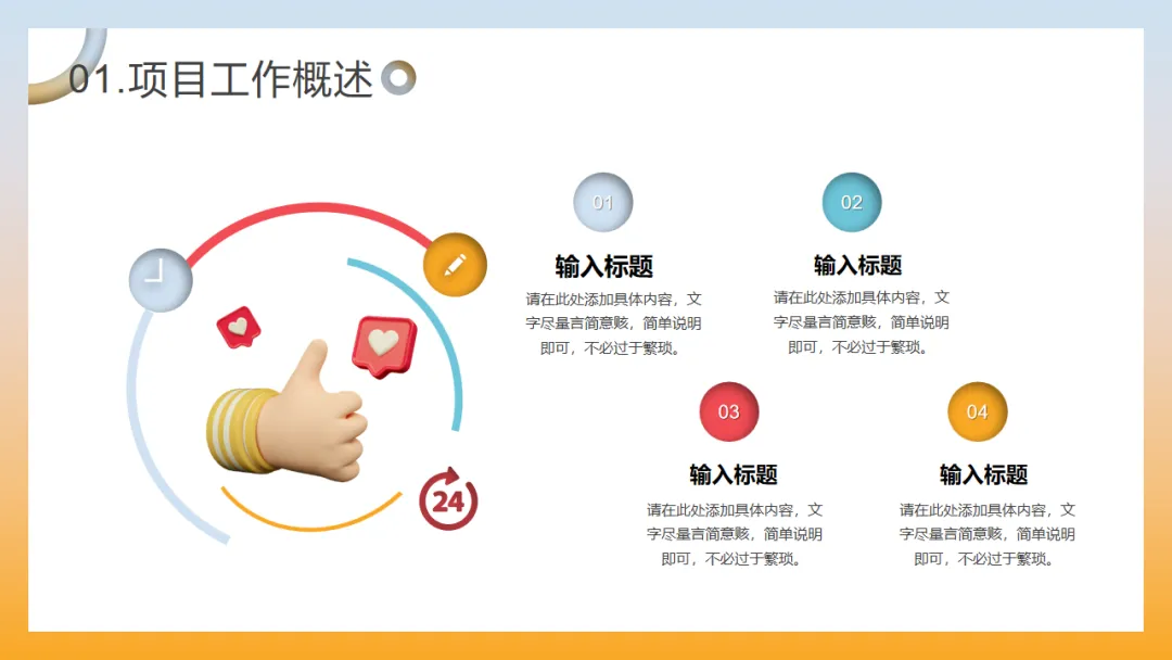 - 逻辑清晰,框架完整预设工作概述 - 成果展示 - 问题分析 - 未来规划四大核心板块,不用再纠结怎么搭框架,直接填内容就能用,汇报思路超顺畅。