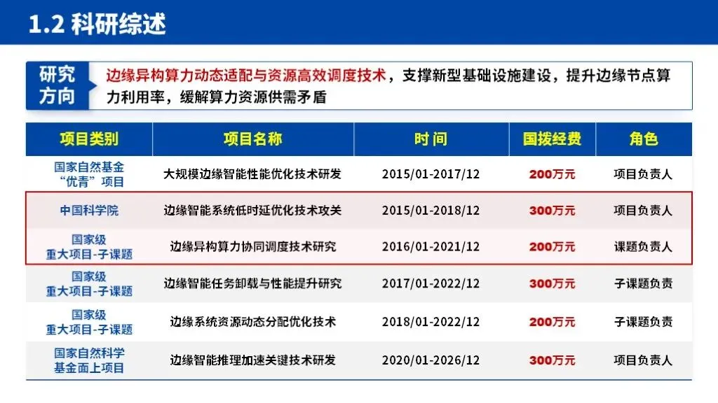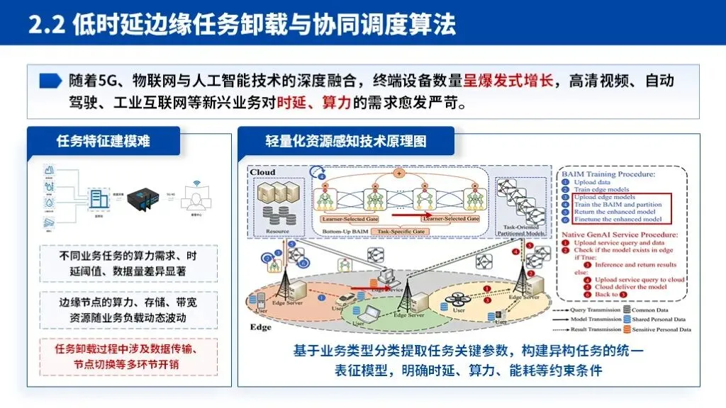PPT采用“个人基础-学术突破-研究规划”递进框架,以边缘智能系统性能优化为核心,贯穿异构算力调度、任务卸载、模型加速等关键技术链,形成从理论创新到产业验证的完整闭环。
