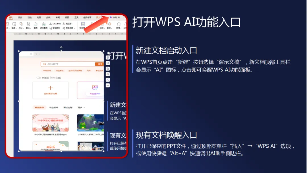 新建演示文稿时,顶部工具栏直接显示“AI”图标;现有文档可通过“插入”→“WPS AI”或快捷键“Alt+A”调出。
