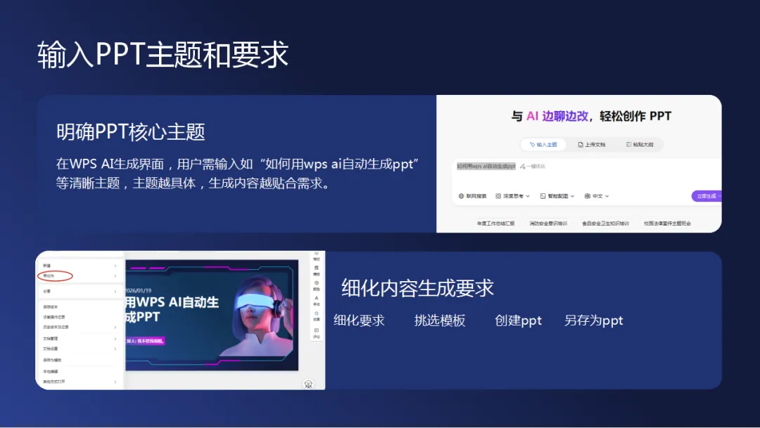 明确主题与要求后输入指令,AI将自动生成大纲,可在对话框中细化需求并挑选风格模板,点击创建即可完成基础制作。