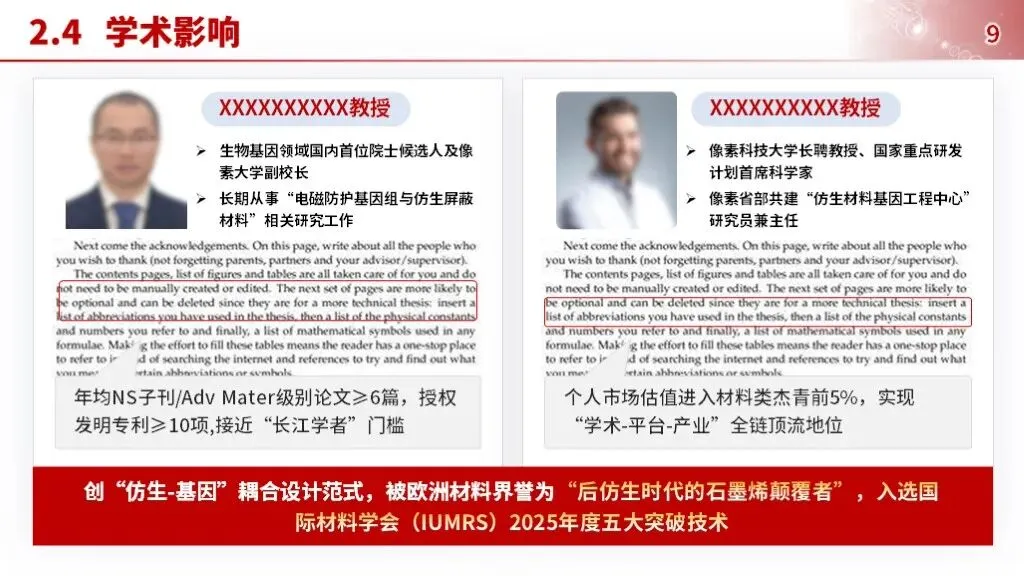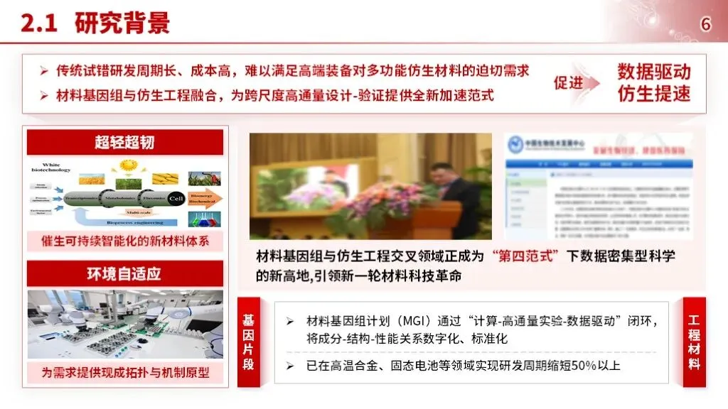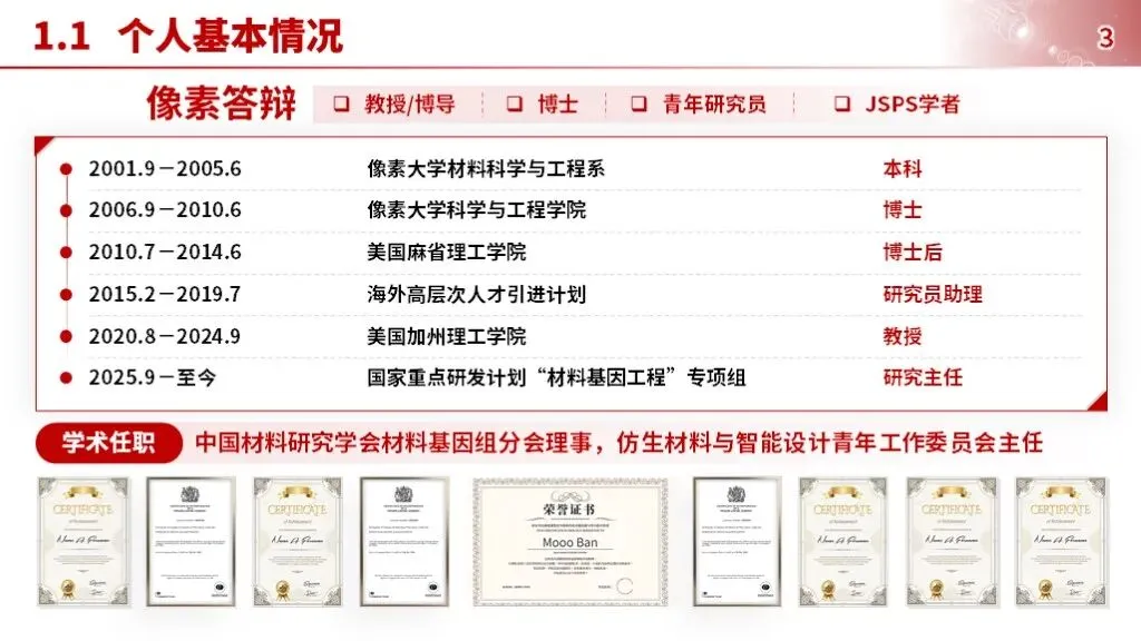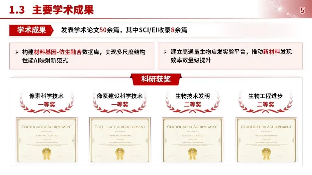 PPT采用“个人基础-学术突破-平台规划”递进框架,以材料基因组与仿生工程交叉融合为核心,贯穿生物启发、数据驱动、工程验证全链条,凸显从基础研究到产业落地的系统性创新布局。