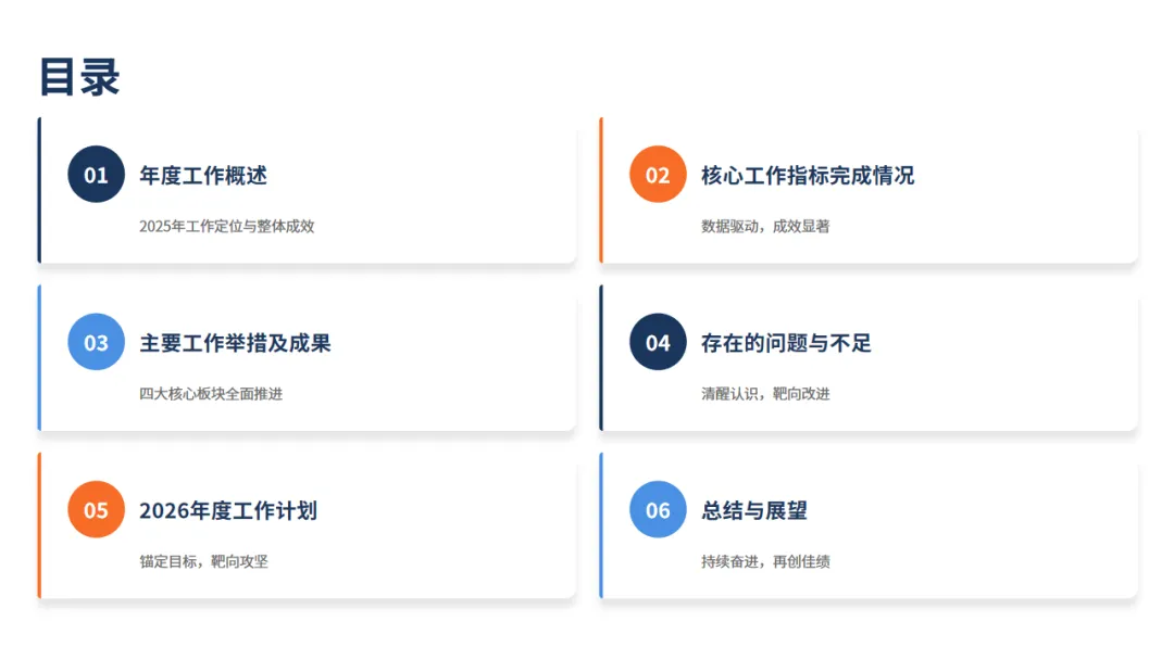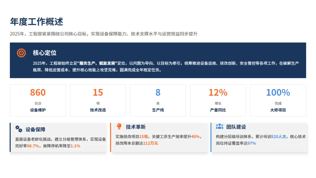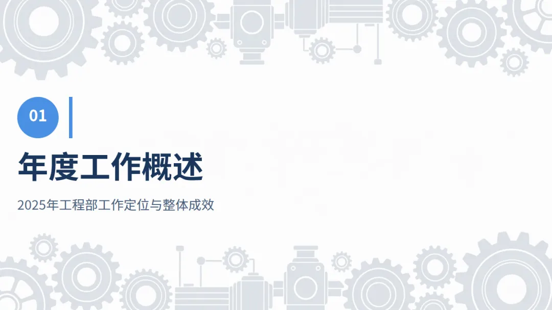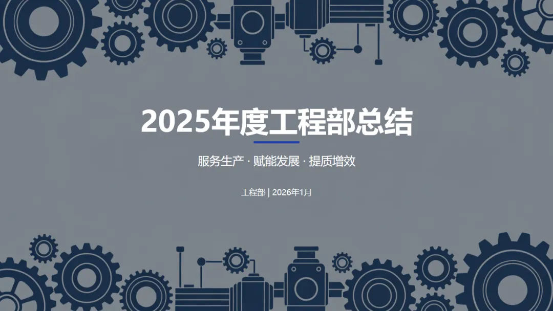本公司2025年度工程部年终工作总结ppt内容如下所示,所有内容、图表都是可以修改编辑的:
