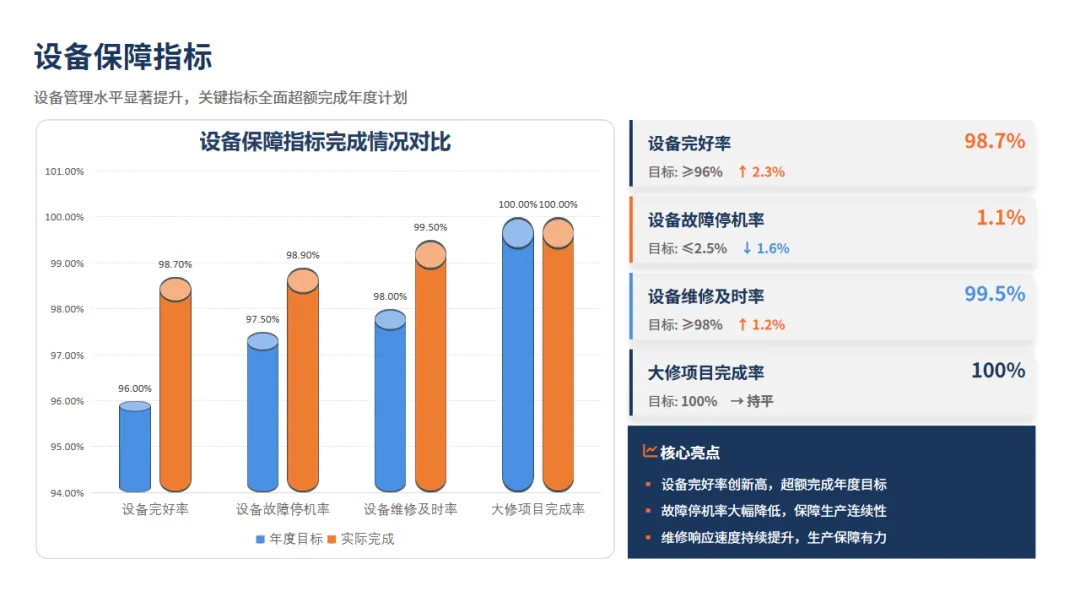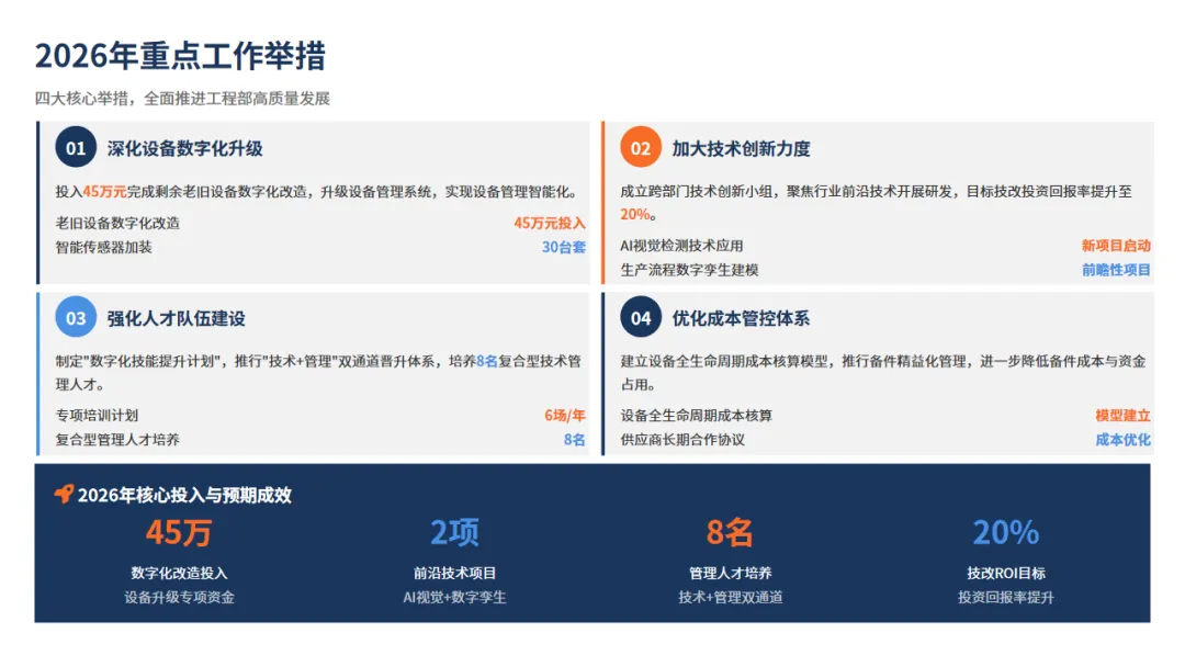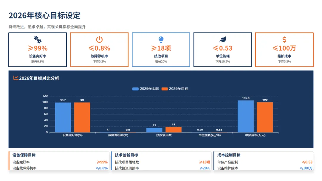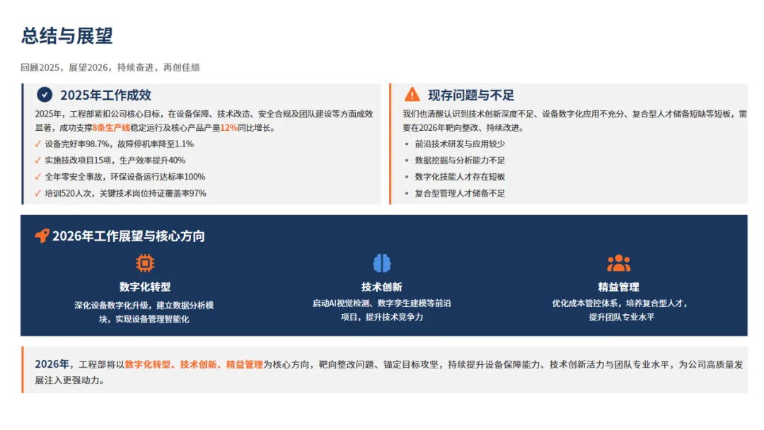 当然,挑战仍然存在,比如面对AI、数字等新浪潮,我们的人才储备,技术创新准备还有欠缺。对此,我们对2026年也做好计划:比如改造老旧设备、组建多部门小组攻坚,大力培养“技术+管理”复合型人才。目标也很明确:就是要让保障更智能,让创新成为新常态,为公司的下一次飞跃,效益提升,打造最可靠的工程引擎。