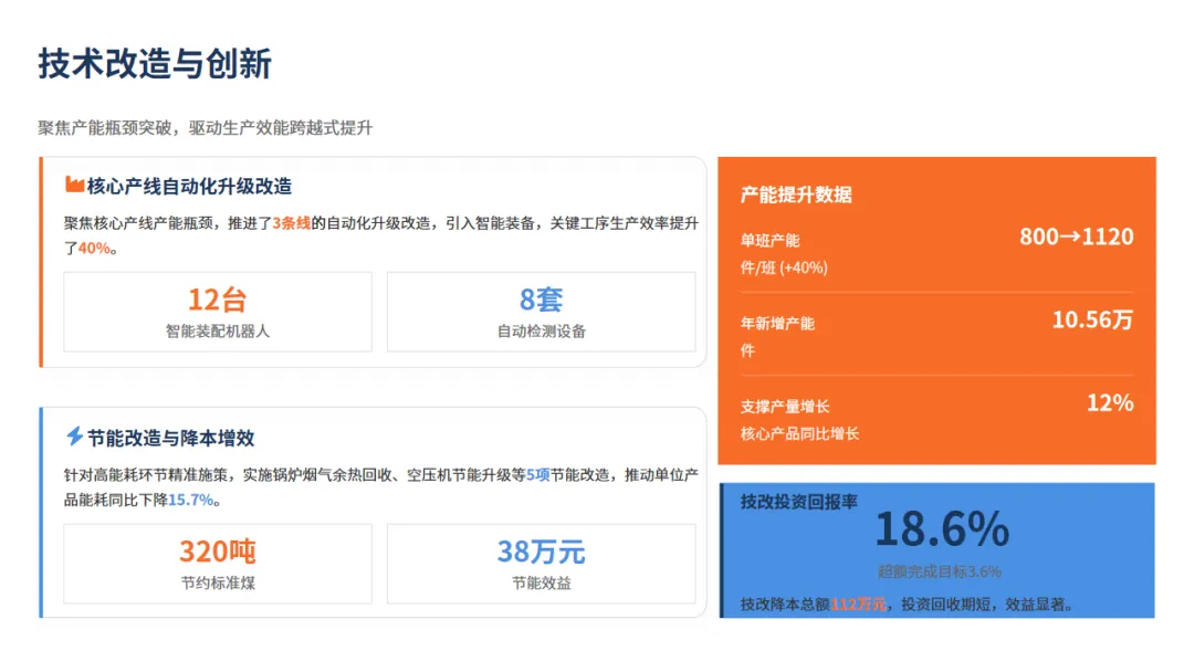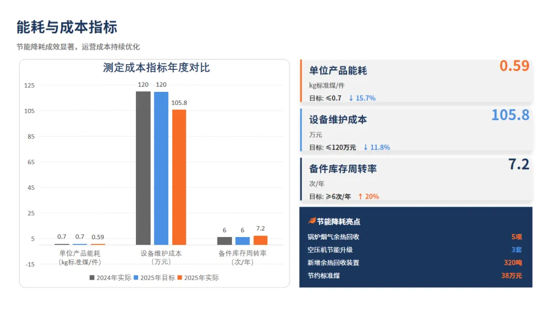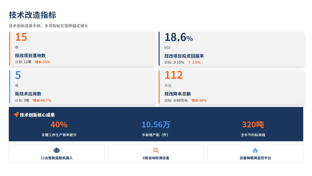 当然这也让我们的效益有所提升:设备部门主导的15项技术改造,不仅让机器人扛起了增产重任,也让锅炉、空压机这些设备为我们节省了大约112万元的真金白银,也让我们的重特大安全事故未发生一起。