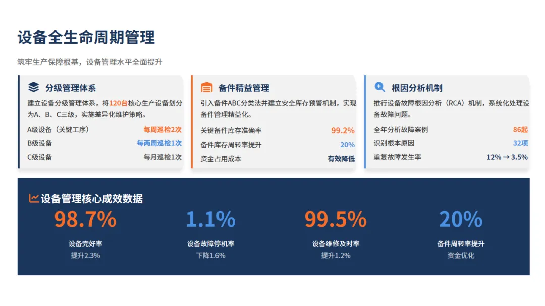 想了解设备部门怎么做到让生产线“几乎忘掉设备存在”的吗?用我们公司的数据来举例一下:首先在产量飙升12%的压力下,我们把设备故障率压低了1.6个百分点,主要方法就是让核心设备健康运行,少出故障。这背后不是靠的运气,而是给我们的台设备进行分级管理、使用物联网提前预警了故障的出现。