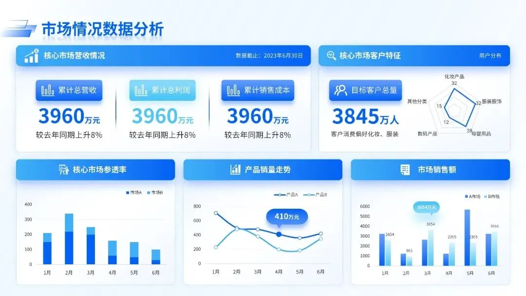 模板解法:直接使用预制的 “战略仪表盘” 页。已将核心指标、对比维度、健康度预警色块设计好,你只需填入数据,一分钟生成让领导一眼看懂的业务健康度报告。