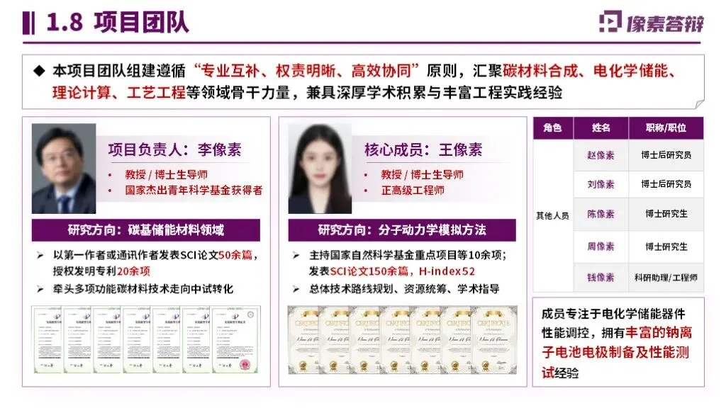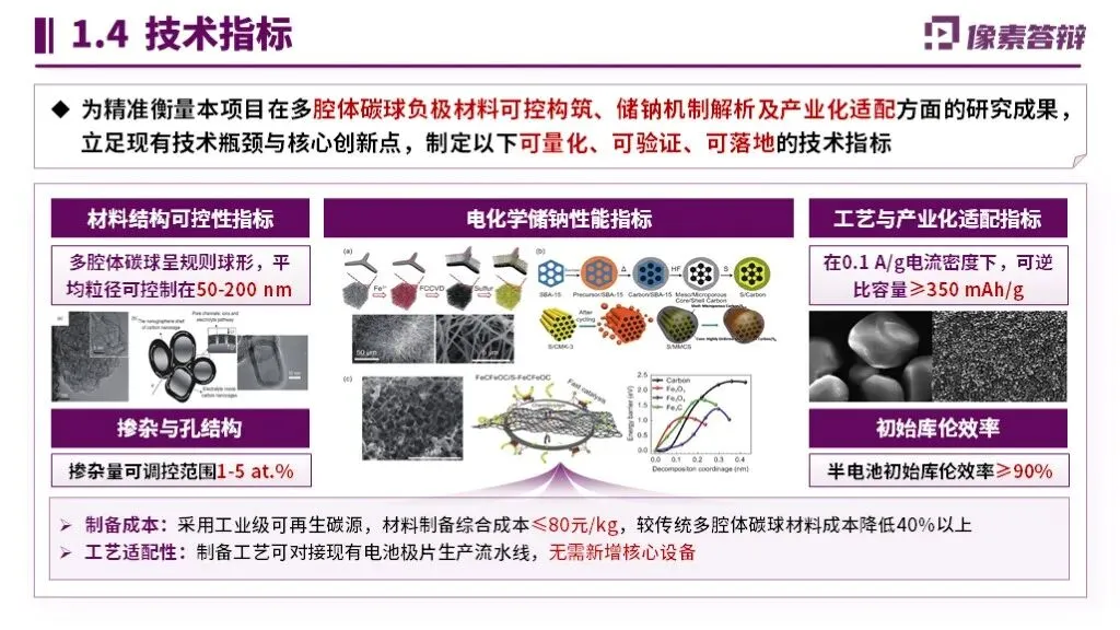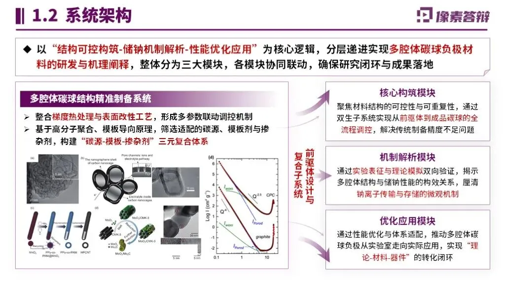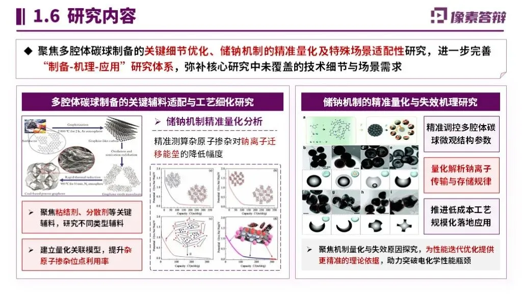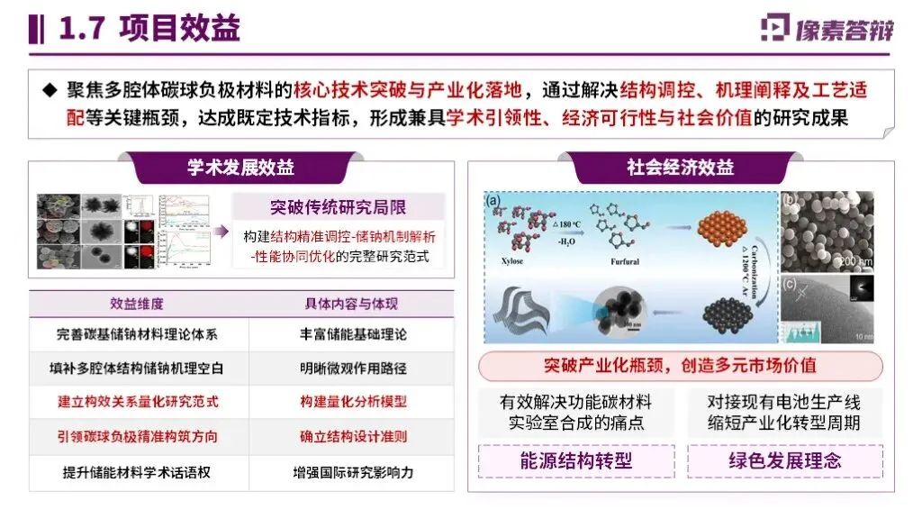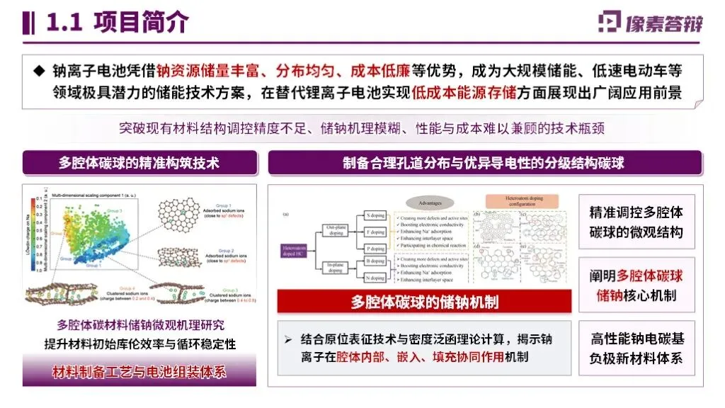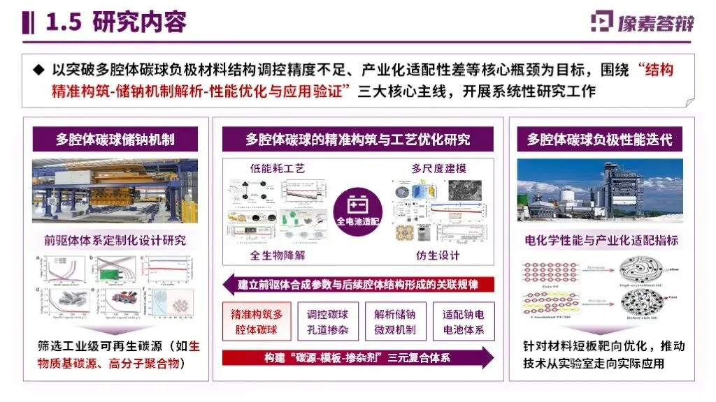 PPT采用“材料瓶颈-构效关系-制备工艺-产业落地”递进框架,以多腔体碳球储钠机理为核心,贯穿结构设计、原位表征、性能验证全链条,形成从基础研究到工程应用的完整闭环。
