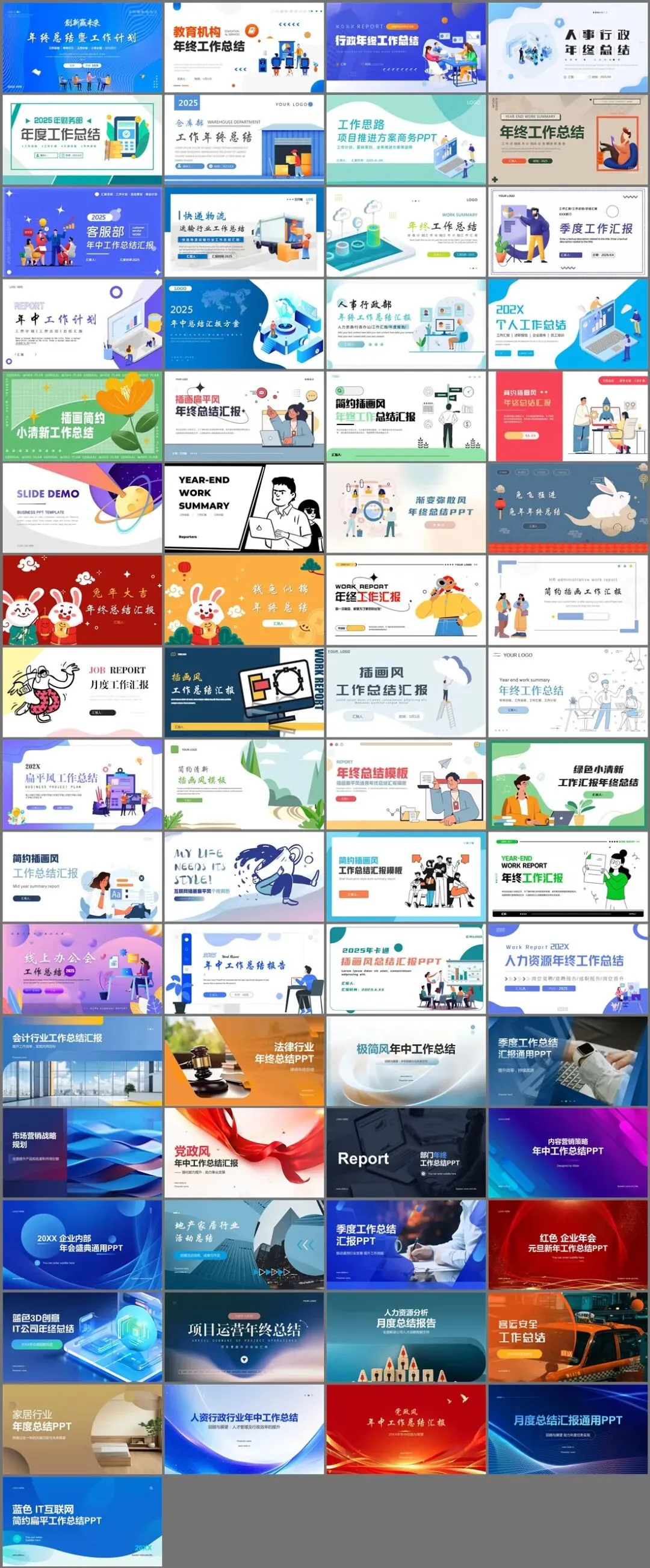 包括了:年终总结PPT、教育机构年终工作总结PPT、行政年终工作总结PPT、仓库部工作年终总结PPT、快递物流PPT、季度工作汇报PPT、插画简约小清新工作总结PPT、插画扁平风PPT、渐变弥散风年终总结PPT、月度工作汇报PPT、线上办公会工作总结PPT、年中工作总结报告PPT、人力资源年终工作总结PPT、线上办公会工作总结PPT、法律行业年终总结PPT、党政风年中工作总结PPT、地产家居行业活动总结PPT、项目运营年终总结PPT、客运安全工作总结PPT、蓝色IT互联网工作总结PPT等。