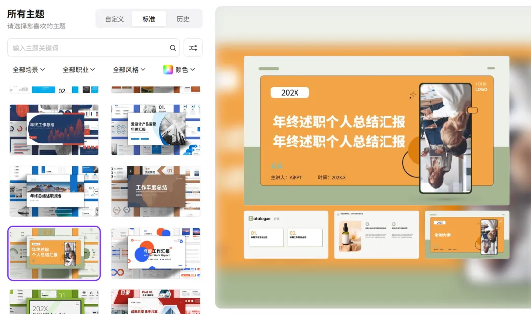 作为我最早接触的AI PPT工具之一,AIPPT在年终汇报ppt制作场景中表现得十分稳定,也是我日常使用频率较高的软件之一。它是国内较早布局AI PPT领域的平台,经过多年迭代,已经形成了从内容生成到设计落地的完整生态,不管是新手还是有一定经验的用户,都能快速上手。