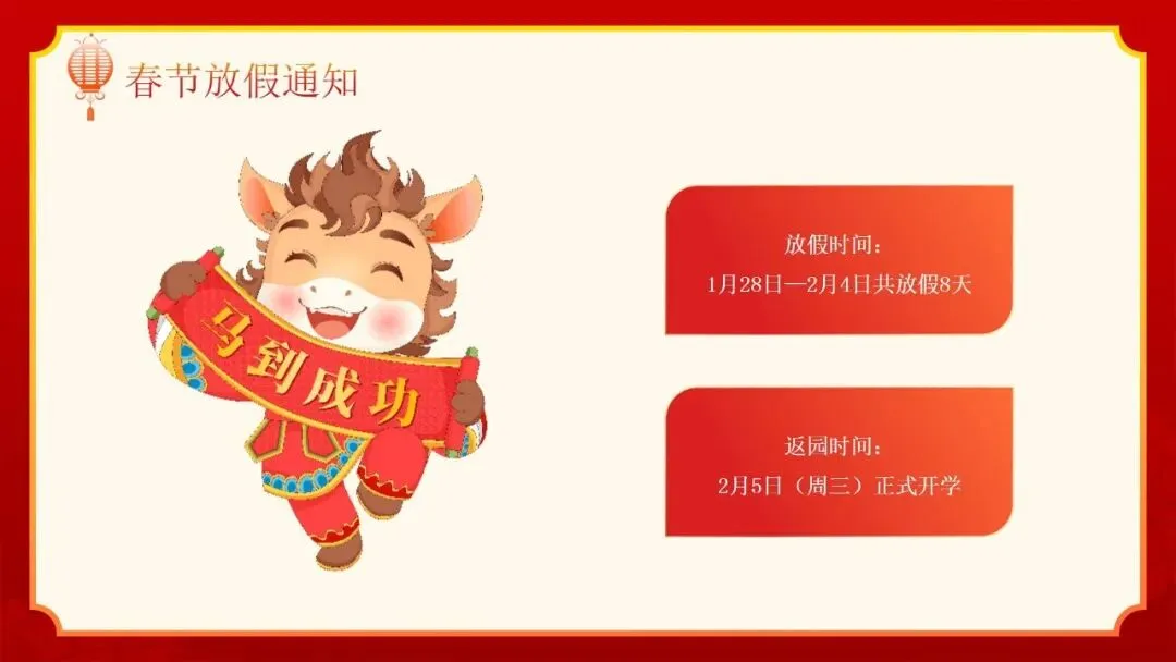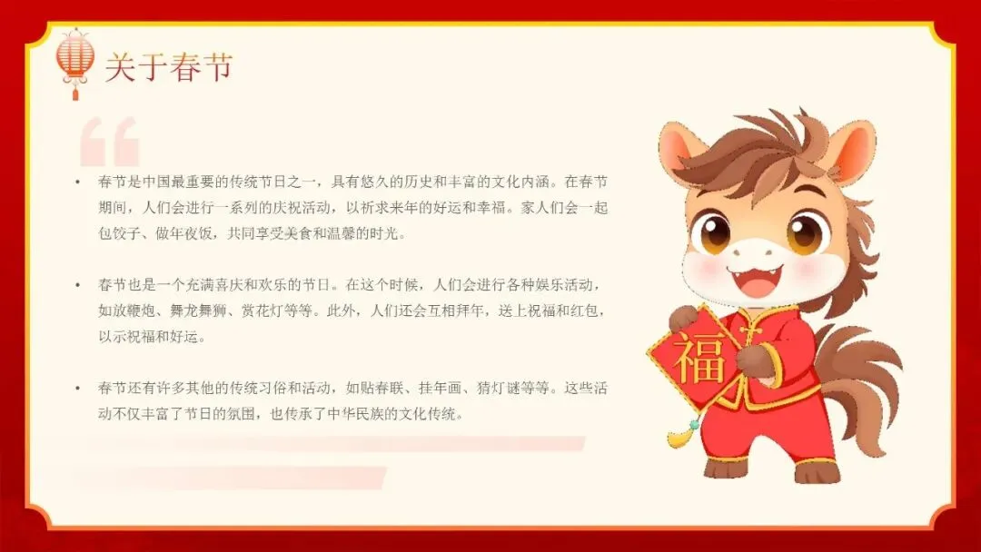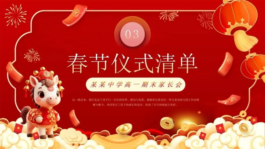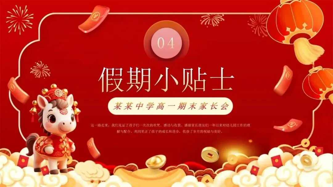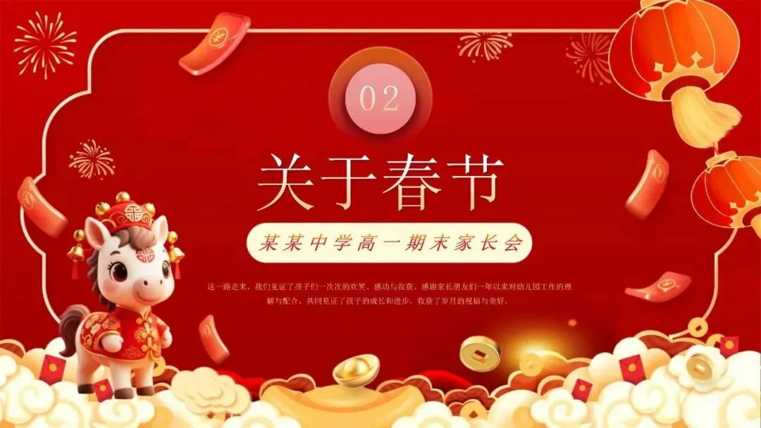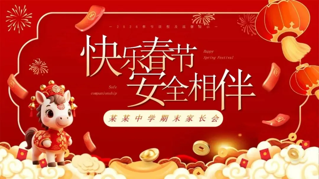 【红色卡通小马背景的“快乐春节安全相伴”期末家长会PPT模板】