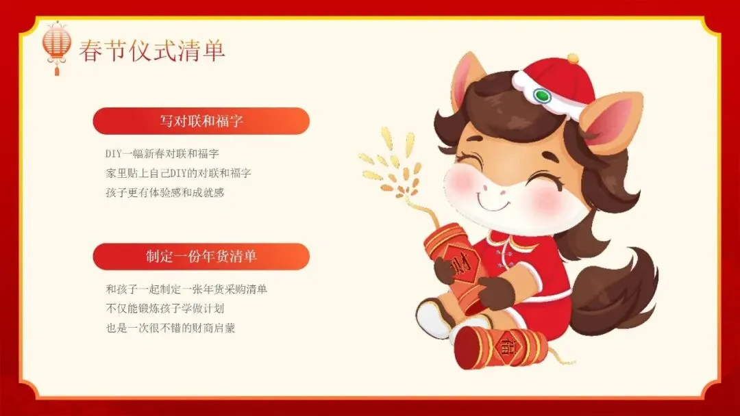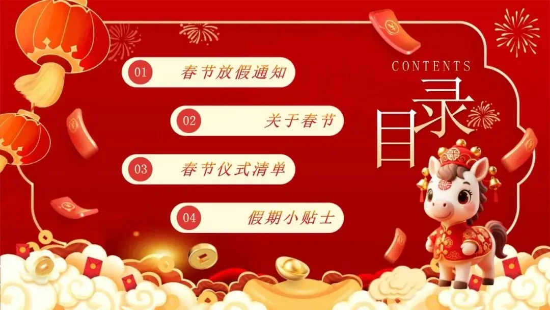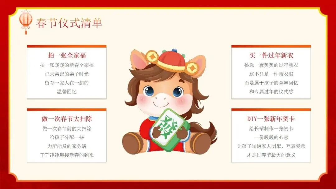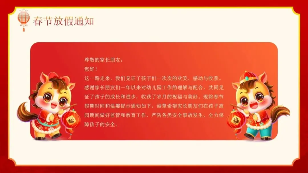 这是一套红色卡通小马背景的“快乐春节安全相伴”期末家长会PPT模板,共17页